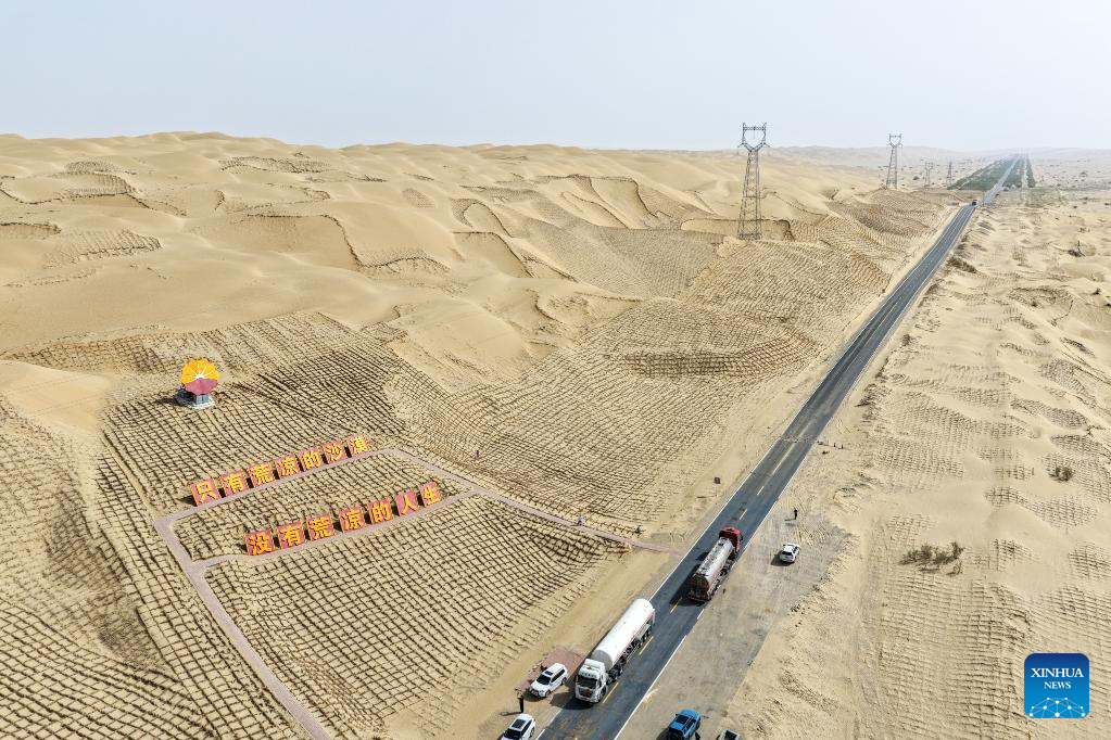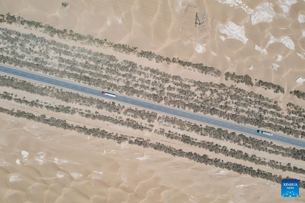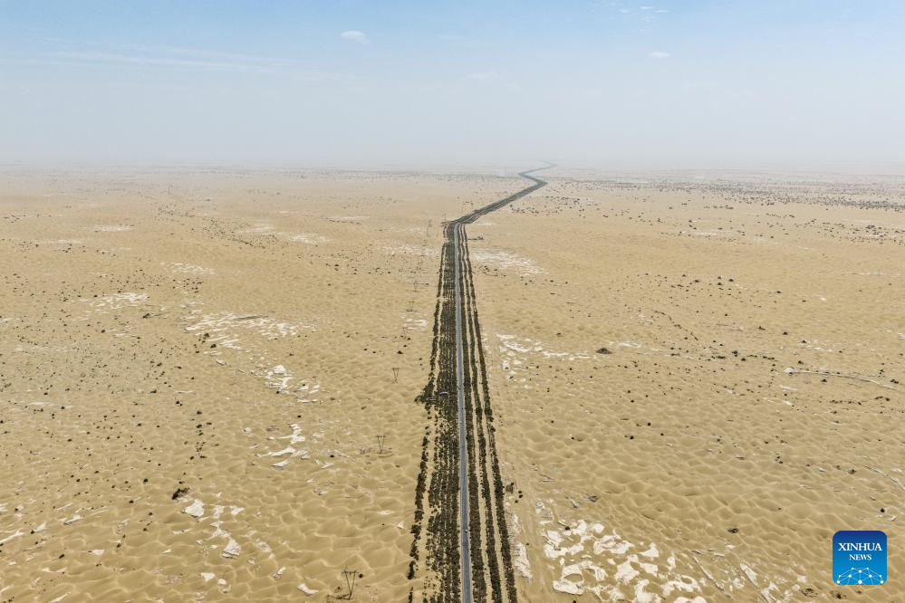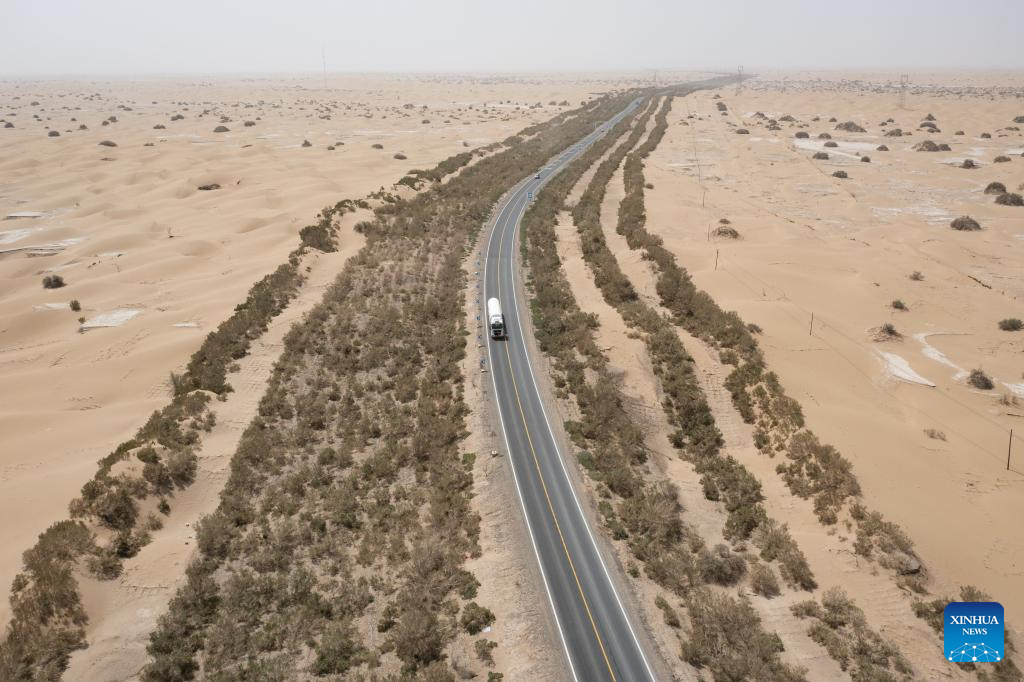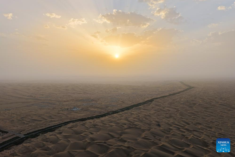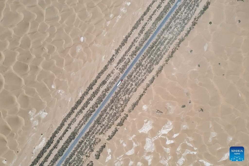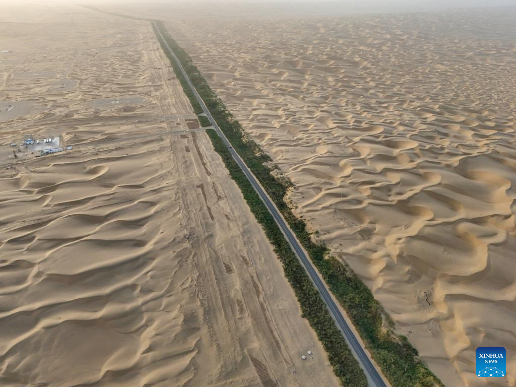 An aerial drone photo taken on July 18, 2025 shows the Tarim Desert Highway traversing through the Taklimakan Desert and the shelterbelt planted along it in northwest China's Xinjiang Uygur Autonomous Region. The 522-km highway runs across the Taklimakan Desert, the world's second-largest shifting sand desert. (Xinhua/Hu Huhu)