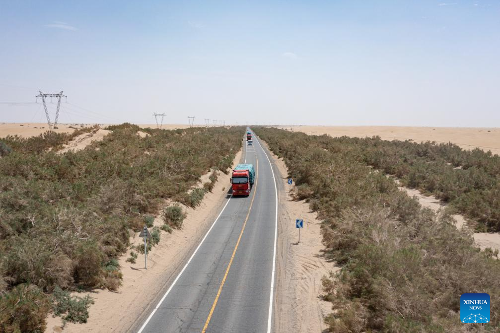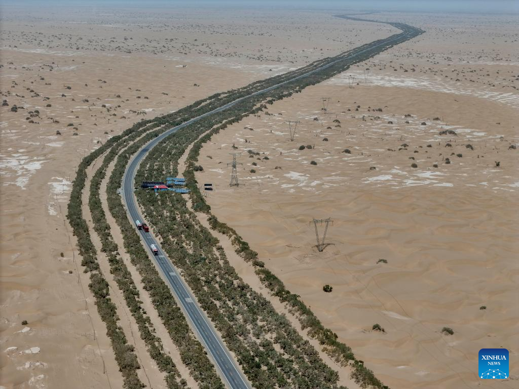 An aerial drone photo taken on July 19, 2025 shows a section of the Tarim Desert Highway and the shelterbelt planted along it in northwest China's Xinjiang Uygur Autonomous Region. The 522-km highway runs across the Taklimakan Desert, the world's second-largest shifting sand desert. (Xinhua/Meng Tao)
