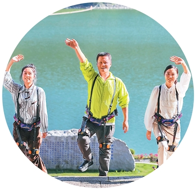 Photo shows tourists wearing exoskeleton robots at the Shizhu Mountain scenic area in Fuzhou, southeast China's Fujian Province. (Photo/Xie Guiming)