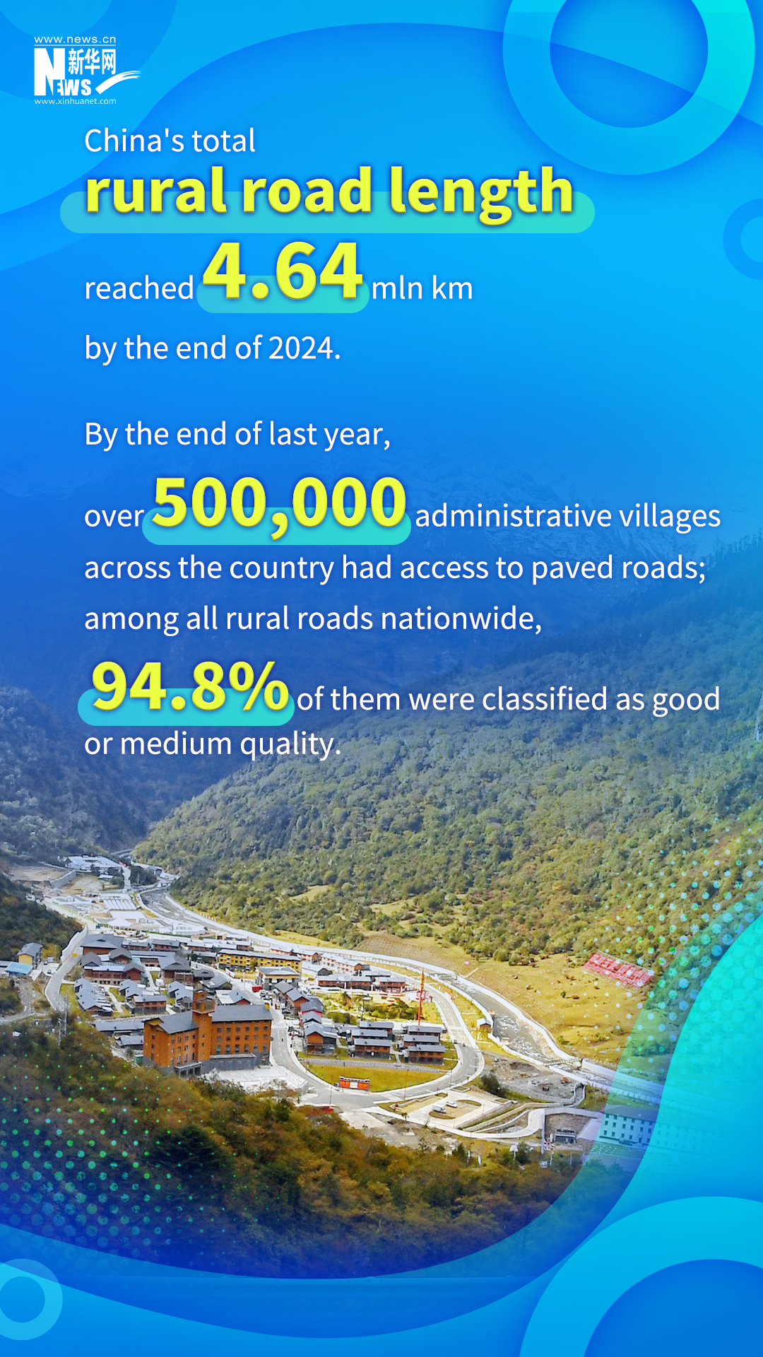 As of end-2024, rural roads reached 4.64 million km, and over 30,000 townships and 500,000 administrative villages have been connected by paved roads, Liu said.