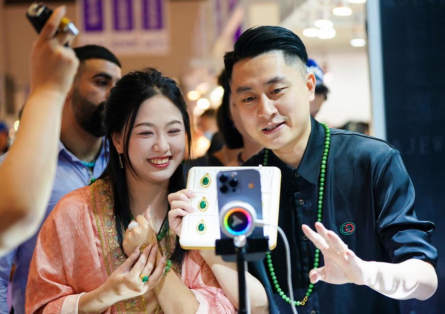 People sell jade jewelry via livestreaming at the 2025 China Kunming International Stone Expo in Kunming, southwest China's Yunnan Province, on July 10, 2025. (Xinhua/Chen Xinbo)