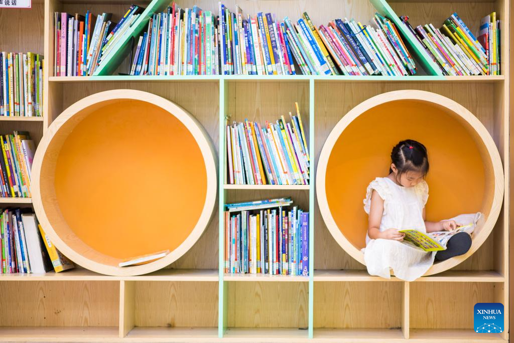 A girl reads a book at a community service center in Shangcheng District of Hangzhou City, east China's Zhejiang Province, July 21, 2025. Community service centers in Hangzhou provide childcare assistance and various activities to enrich children's summer vacation. (Xinhua/Jiang Han)