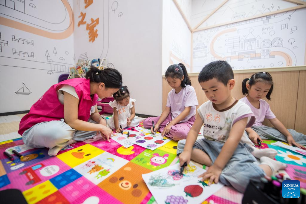 Children play coloring games with their teacher at a community service center in Gongshu District of Hangzhou City, east China's Zhejiang Province, July 21, 2025. Community service centers in Hangzhou provide childcare assistance and various activities to enrich children's summer vacation. (Xinhua/Jiang Han)