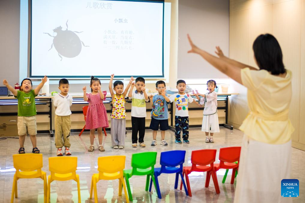 Children sing songs with their teacher at a community service center in Shangcheng District of Hangzhou City, east China's Zhejiang Province, July 21, 2025. Community service centers in Hangzhou provide childcare assistance and various activities to enrich children's summer vacation. (Xinhua/Jiang Han)