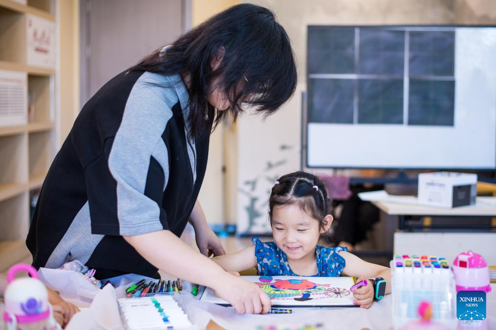 A girl learns painting under a teacher's guidance at a community service center in Shangcheng District of Hangzhou City, east China's Zhejiang Province, July 21, 2025. Community service centers in Hangzhou provide childcare assistance and various activities to enrich children's summer vacation. (Xinhua/Jiang Han)