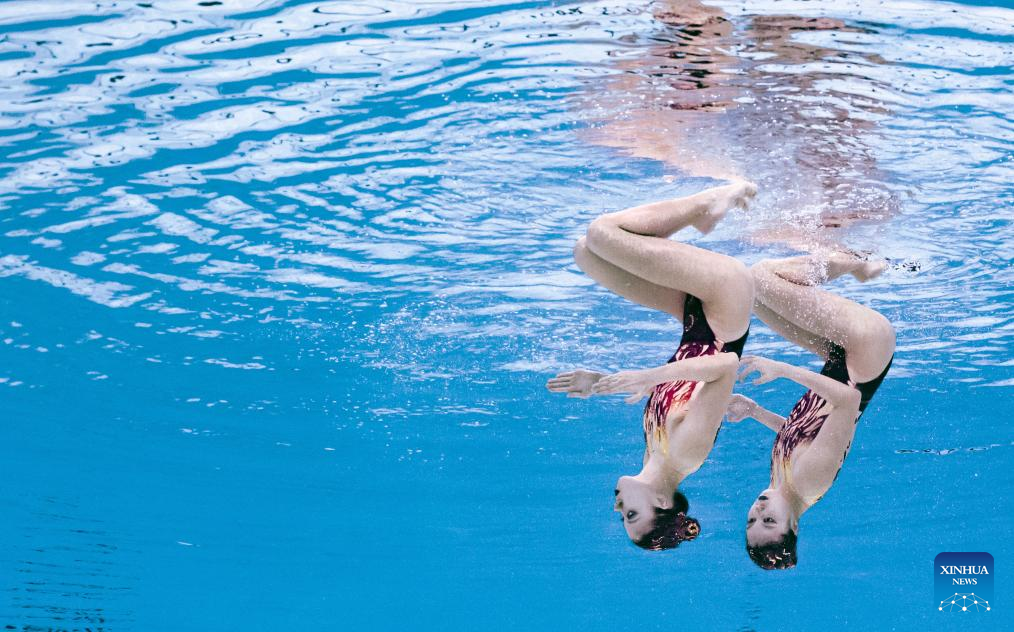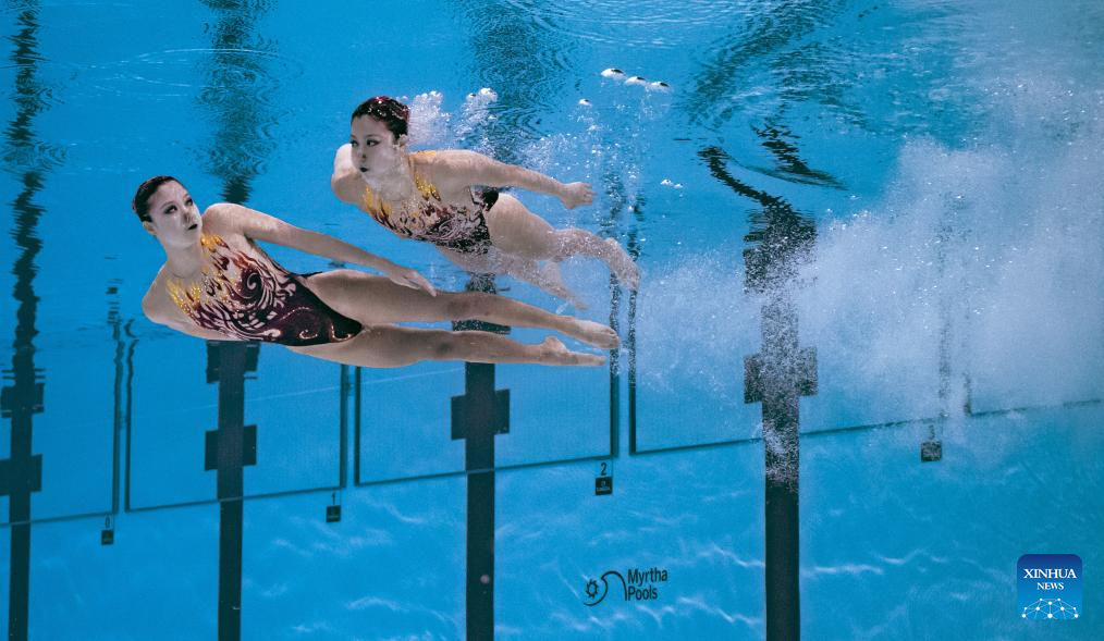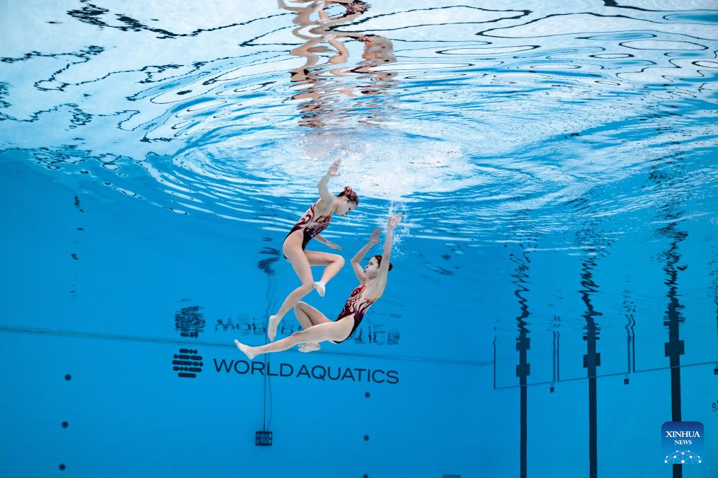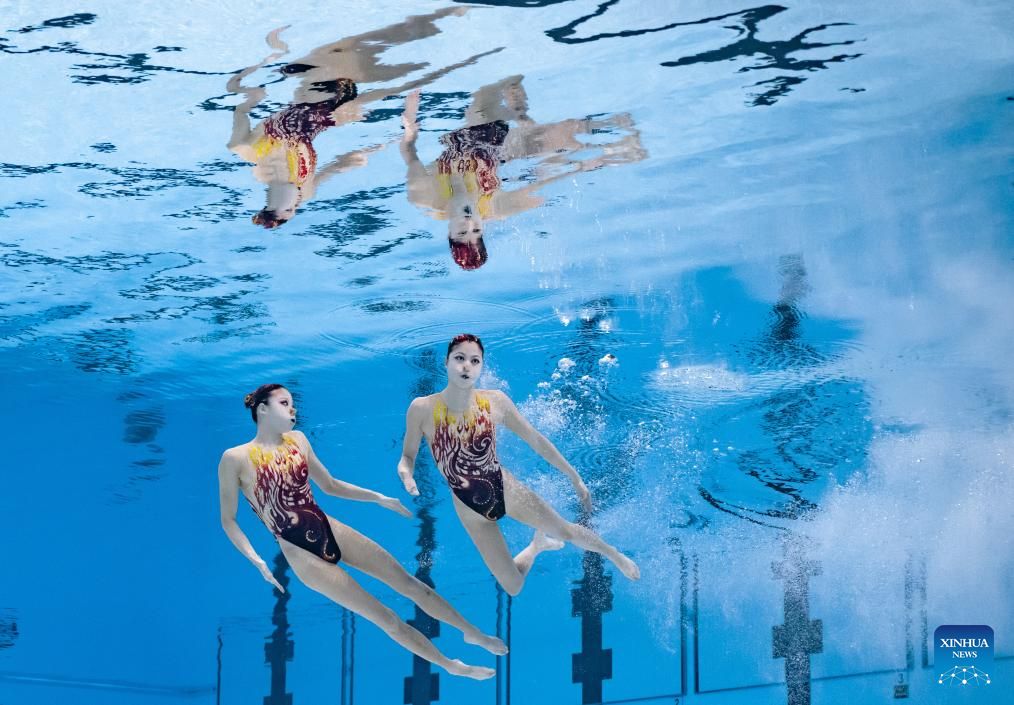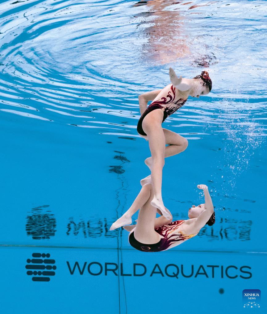 Lin Yanhan/Lin Yanjun of China perform during the women's duet technical final of artistic swimming at the World Aquatic Championships in Singapore, July 21, 2025. (Xinhua/Luo Yuan)