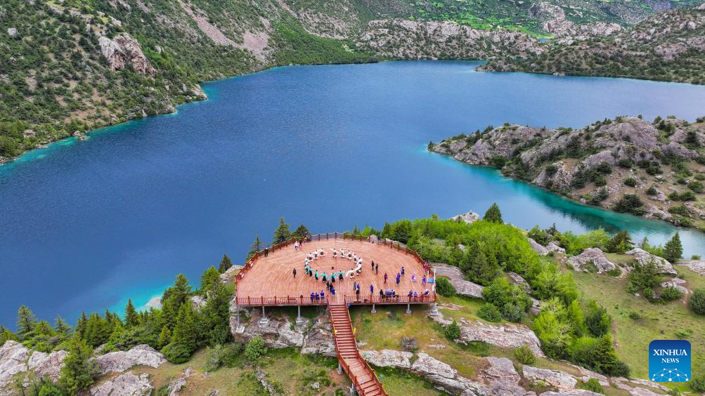 Dancers perform on a sightseeing platform by the "three-color lake" in Banbar County, Qamdo, southwest China's Xizang Autonomous Region, July 20, 2025. The "three-color lake," covering an area of about 150,000 square meters, comprises three hill-separated ponds which display three distinct colors due to their varying depths and sediments. (Xinhua/Jigme Dorje)
