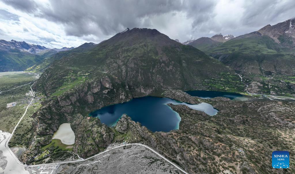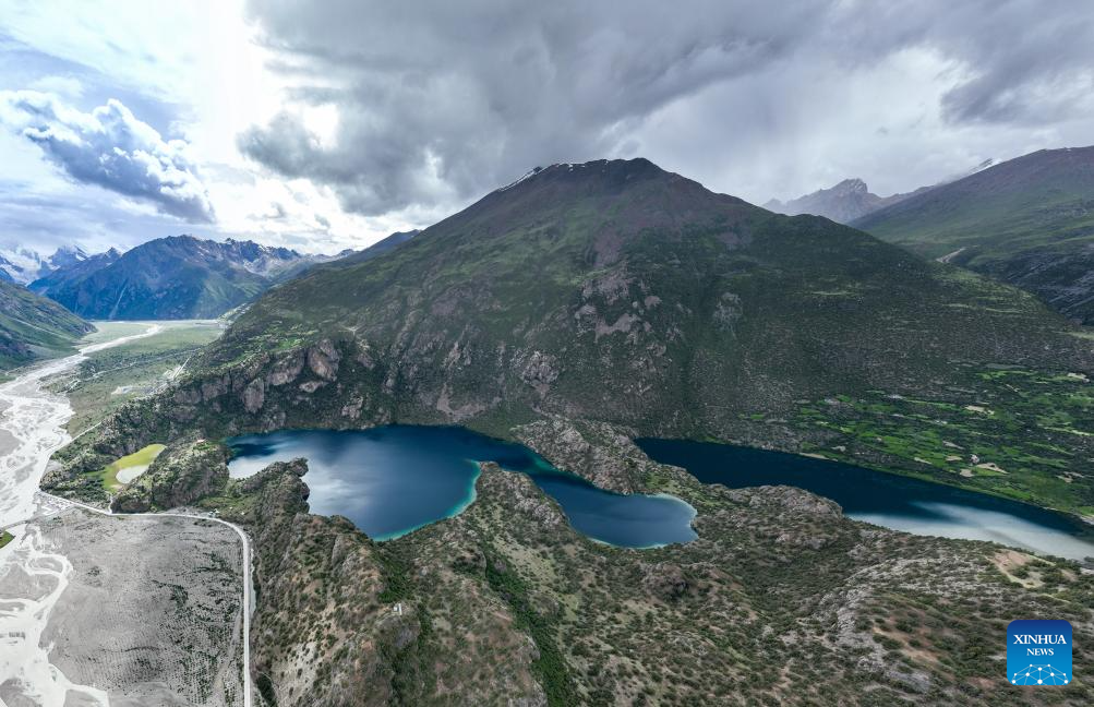 An aerial drone photo taken on July 20, 2025 shows the "three-color lake" in Banbar County, Qamdo, southwest China's Xizang Autonomous Region. The "three-color lake," covering an area of about 150,000 square meters, comprises three hill-separated ponds which display three distinct colors due to their varying depths and sediments. (Xinhua/Jigme Dorje)