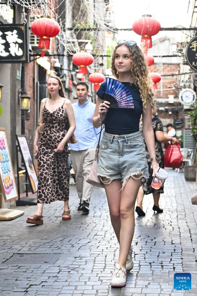 Tourist Sonya Buryak from Russia visits Tianzifang art area in Shanghai, east China, July 21, 2025. Thanks to China's visa-free policies and related measures, the popularity of both travel and shopping in China among foreigners has risen, serving as a boost to the country's tourism development.