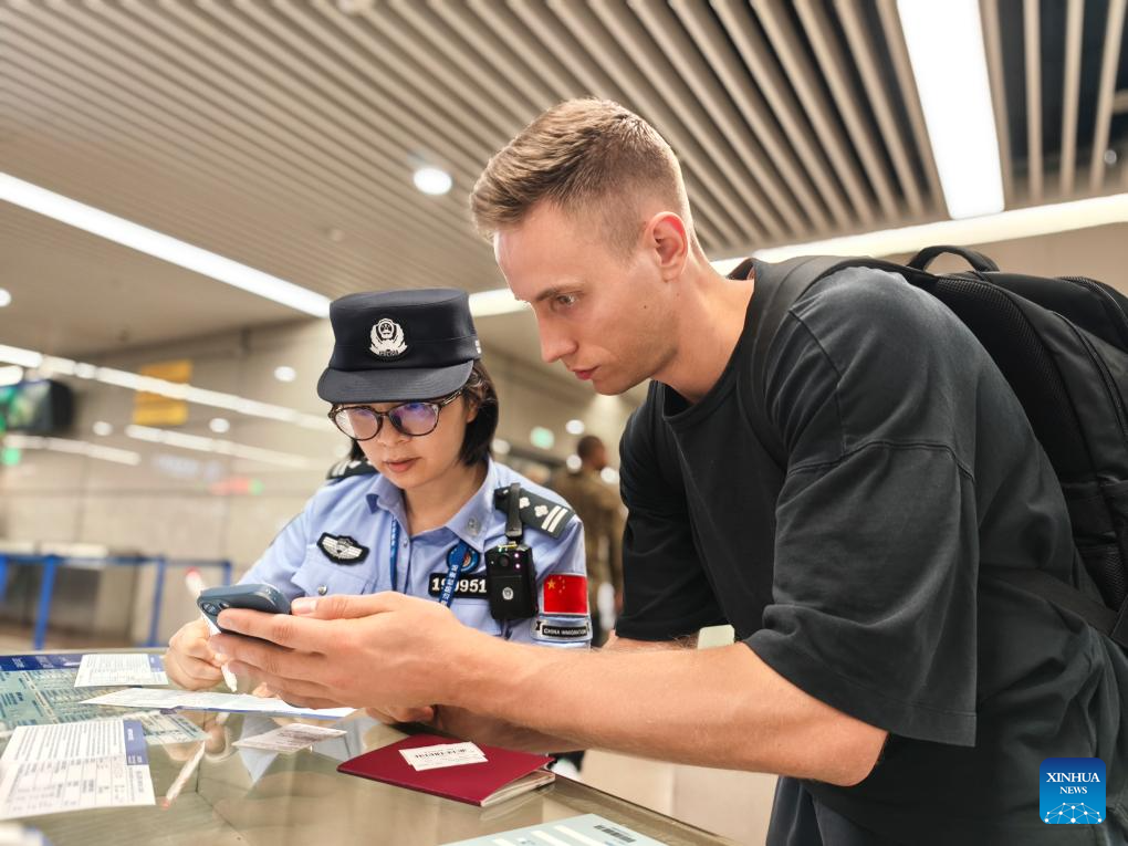A police officer helps a foreign tourist (R) with entry procedures in Shanghai, east China, July 18, 2025. Thanks to China's visa-free policies and related measures, the popularity of both travel and shopping in China among foreigners has risen, serving as a boost to the country's tourism development.