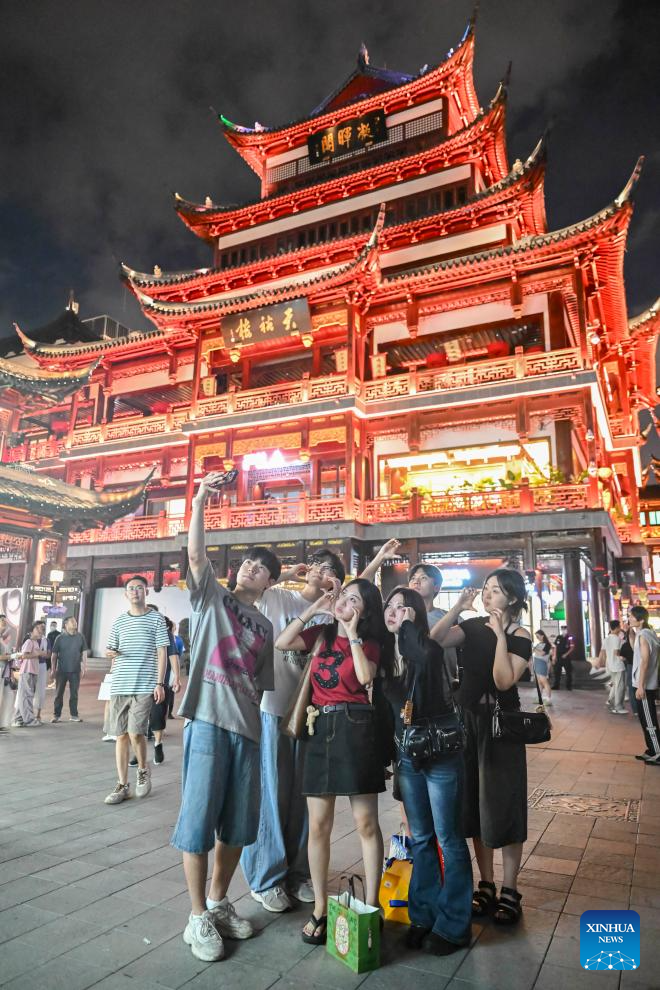 Tourists from South Korea take a selfie at Yuyuan Garden Mall in Shanghai, east China, July 21, 2025. Thanks to China's visa-free policies and related measures, the popularity of both travel and shopping in China among foreigners has risen, serving as a boost to the country's tourism development.