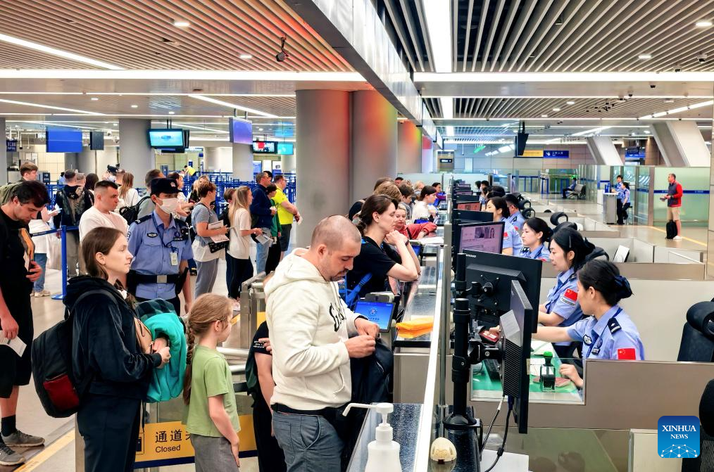 Inbound tourists go through border inspection check at Shanghai Pudong International Airport in Shanghai, east China, July 16, 2025. Thanks to China's visa-free policies and related measures, the popularity of both travel and shopping in China among foreigners has risen, serving as a boost to the country's tourism development.