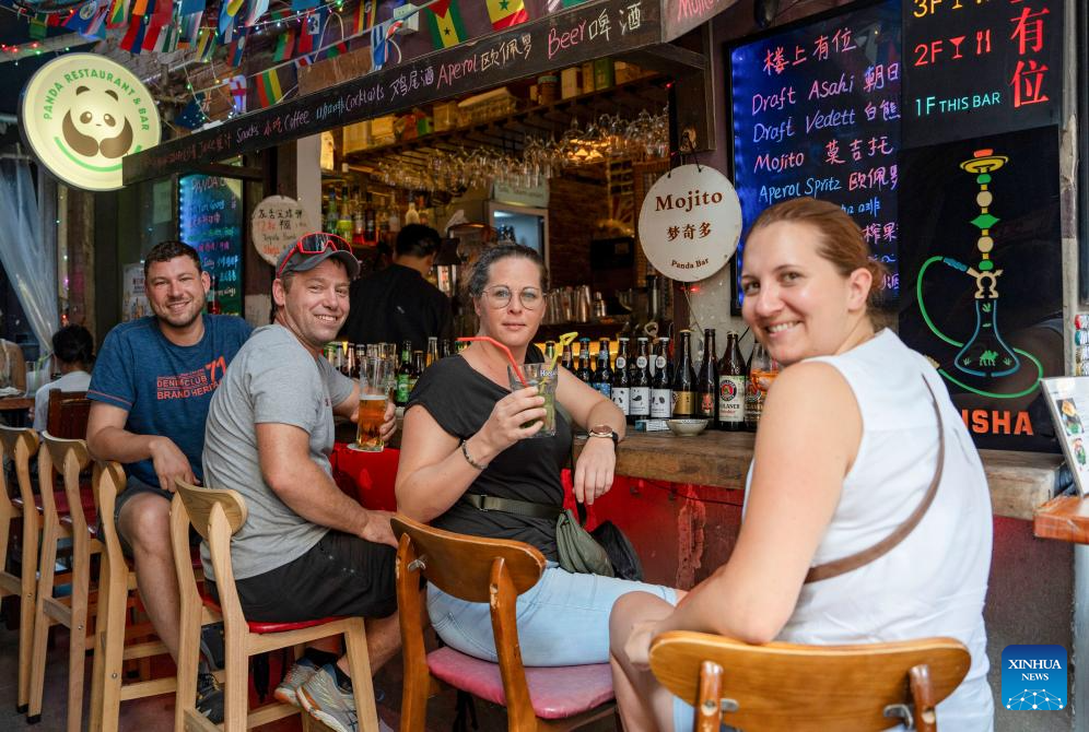 Tourists from Austria have drinks at a bar in Tianzifang art area in Shanghai, east China, July 21, 2025. Thanks to China's visa-free policies and related measures, the popularity of both travel and shopping in China among foreigners has risen, serving as a boost to the country's tourism development.