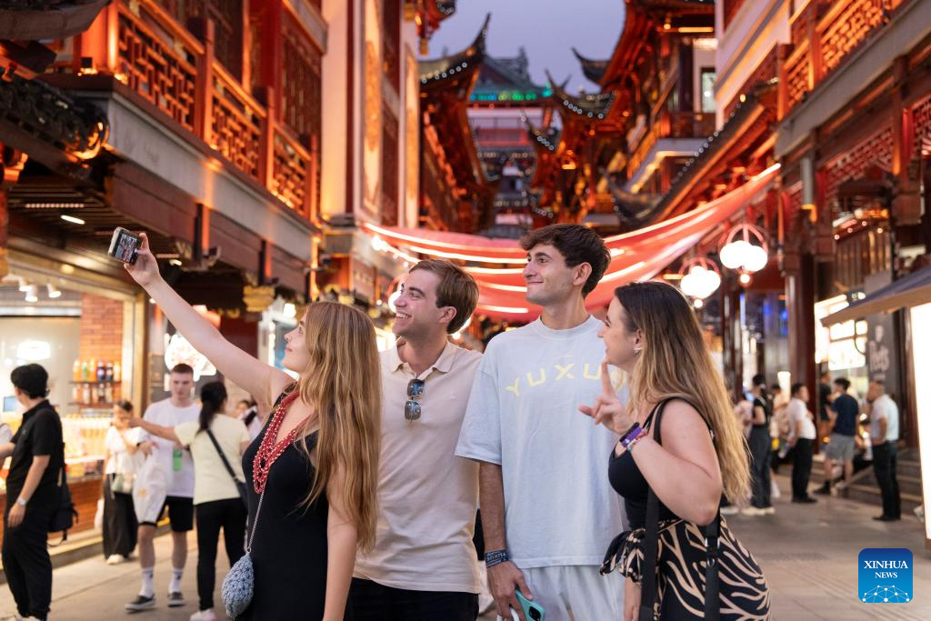 Tourists from Spain take a selfie at Yuyuan Garden Mall in Shanghai, east China, July 21, 2025. Thanks to China's visa-free policies and related measures, the popularity of both travel and shopping in China among foreigners has risen, serving as a boost to the country's tourism development.