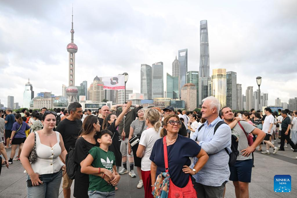 Tourists from Italy visit the Bund area in Shanghai, east China, July 21, 2025. Thanks to China's visa-free policies and related measures, the popularity of both travel and shopping in China among foreigners has risen, serving as a boost to the country's tourism development.