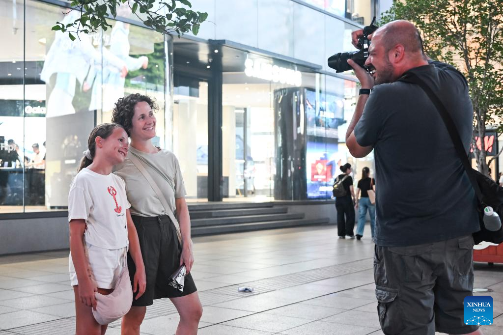 Tourist Paolo Braconi (R) from Italy takes photos for his wife Laura Brioschi (C) and daughter Bianca Braconi, at Nanjing Road in Shanghai, east China, July 17, 2025. Thanks to China's visa-free policies and related measures, the popularity of both travel and shopping in China among foreigners has risen, serving as a boost to the country's tourism development.
