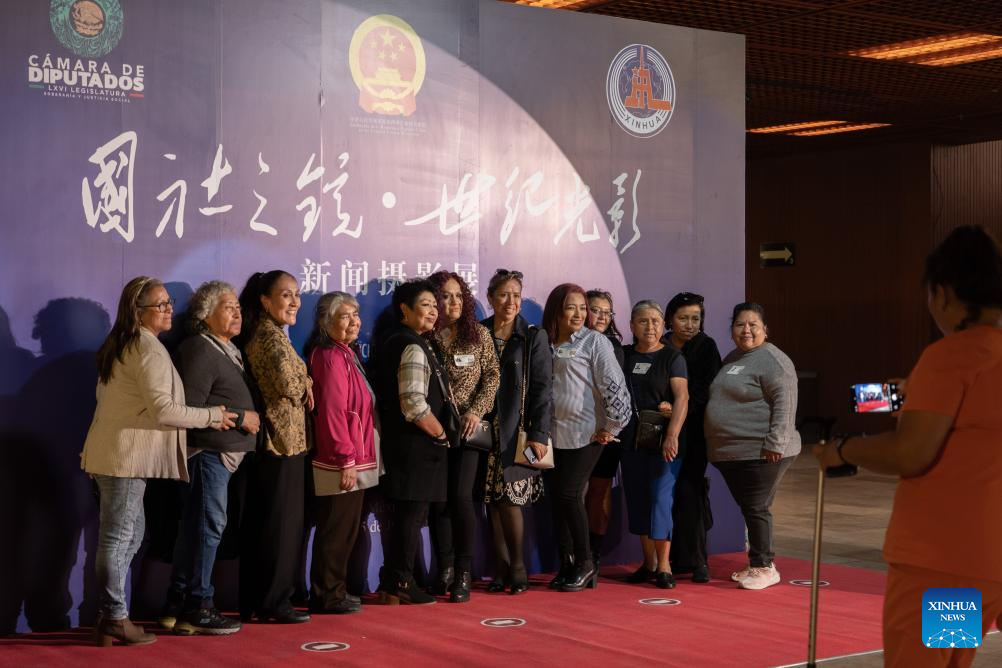 Visitors take group photos at a news photo exhibition in Mexico City, Mexico, July 18, 2025. The news photo exhibition, co-organized by Xinhua News Agency and the Mexican Chamber of Deputies, kicked off here on July 18. (Xinhua/Li Mengxin)