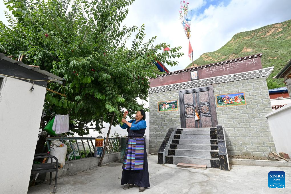 Soinam Kangzhu picks plums at her renovated yard in Lnadingxooi Village, Zhomda Township, Nang County of southwest China's Xizang Autonomous Region, July 21, 2025.