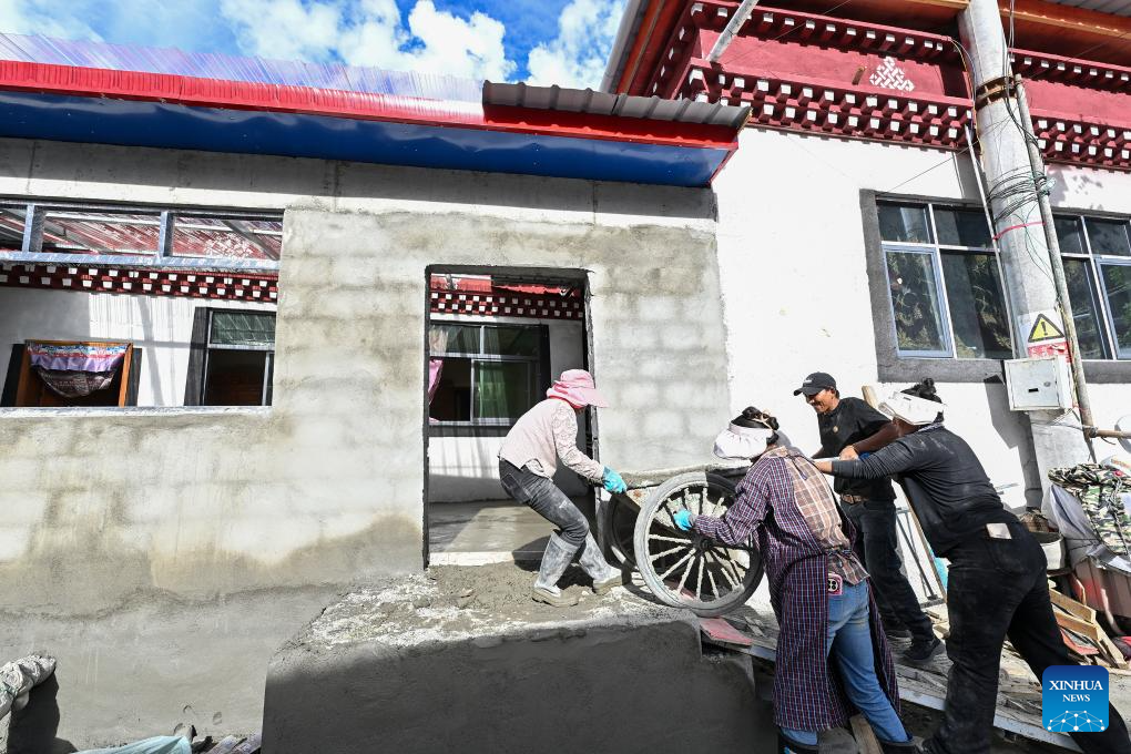 Cewang Norbu (2nd R) moves building materials with the help from other villagers to renovate his house in Lnadingxooi Village, Zhomda Township, Nang County of southwest China's Xizang Autonomous Region, July 21, 2025. (Xinhua/Li Xin)