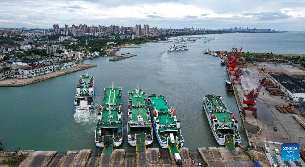 An aerial drone photo taken on July 22, 2025 shows vehicles driving away from ferry ships at Xiuying Port in Haikou, south China's Hainan Province. The passenger and freight ferry service in the Qiongzhou Strait has been resumed in an orderly manner as the impact of Typhoon Wipha weakens. (Xinhua/Yang Guanyu)