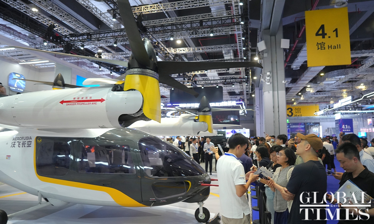 A spokesperson of AutoFlight, a Shanghai-based maker of electric vertical takeoff and landing (eVTOL) aircraft, told the Global Times that the company is showcasing a 1:3 scale model of its five-seat eVTOL aircraft "Prosperity" at the expo. The model illustrates a range of real-world air mobility uses, including intercity commuting, airport shuttles, and aerial sightseeing.