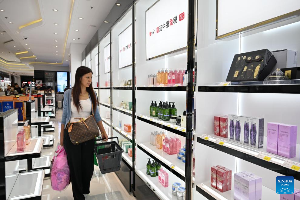 A traveller shops at a duty free shop of Tianjin International Cruise Home Port in Tianjin, north China, July 23, 2025. According to official data, the Tianjin cruise port has facilitated nearly 40,000 inbound and outbound passengers since July of this year, along with 16 cruise ship visits, marking a year-on-year increase of 17 percent. (Xinhua/Sun Fanyue)