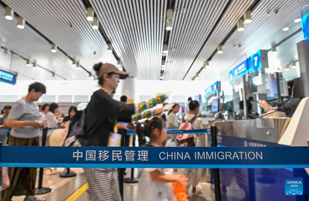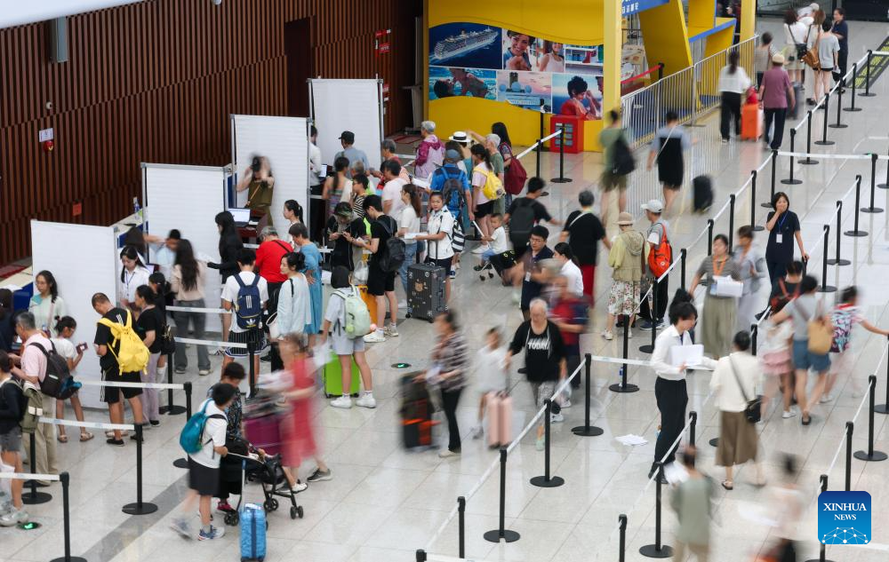 Travellers arrive at Tianjin International Cruise Home Port in Tianjin, north China, July 23, 2025. According to official data, the Tianjin cruise port has facilitated nearly 40,000 inbound and outbound passengers since July of this year, along with 16 cruise ship visits, marking a year-on-year increase of 17 percent. (Xinhua/Sun Fanyue)