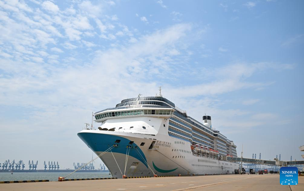 This photo taken on July 23, 2025 shows the Adora Mediterranea Cruise, carrying about 1600 passengers, docking at the Tianjin International Cruise Home Port in Tianjin, north China. According to official data, the Tianjin cruise port has facilitated nearly 40,000 inbound and outbound passengers since July of this year, along with 16 cruise ship visits, marking a year-on-year increase of 17 percent. (Xinhua/Sun Fanyue)