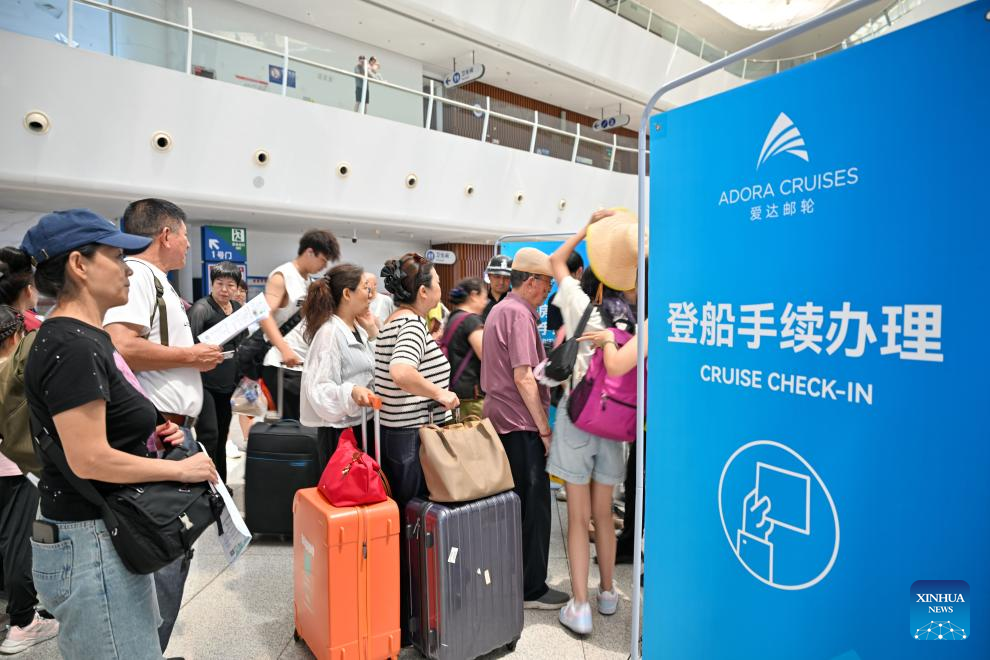 Travellers check in at the Tianjin International Cruise Home Port in Tianjin, north China, July 23, 2025. According to official data, the Tianjin cruise port has facilitated nearly 40,000 inbound and outbound passengers since July of this year, along with 16 cruise ship visits, marking a year-on-year increase of 17 percent. (Xinhua/Sun Fanyue)
