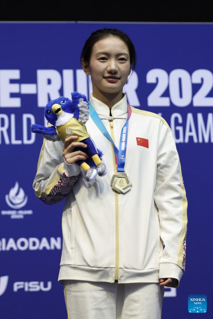 Gold medalist Ouyang Yu of China poses during the awarding ceremony for women's 1m springboard of diving at the Rhine-Ruhr 2025 FISU World University Games in Berlin, Germany, July 23, 2025. (Xinhua/Du Zheyu)