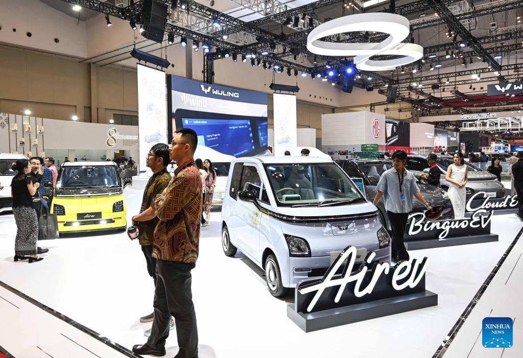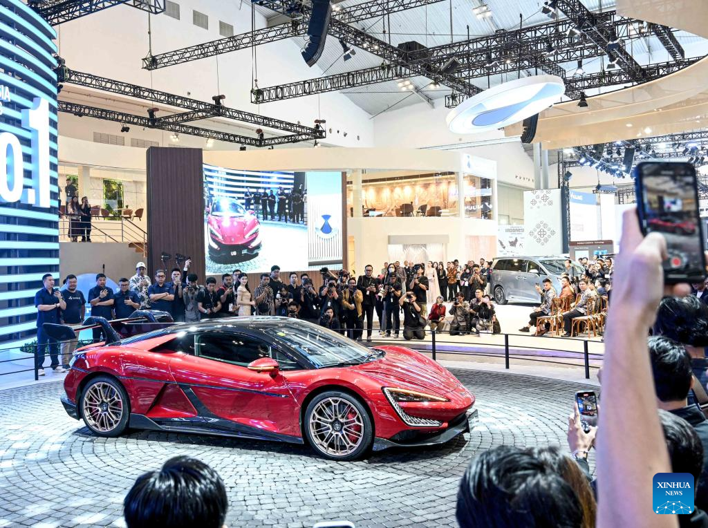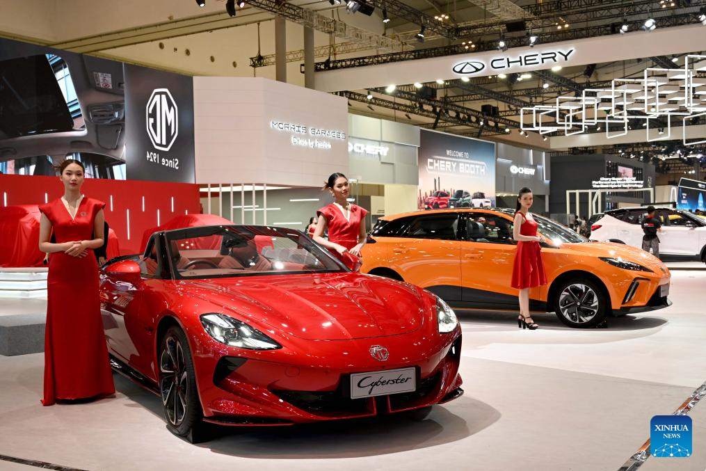 This photo taken on July 23, 2025 shows products of Chinese auto brands during the exclusive media day of GAIKINDO Indonesia International Auto Show (GIIAS) 2025 at the Indonesia Convention Exhibition in Tangerang, Banten Province, Indonesia. The 32nd GIIAS will open to the public from July 24 to Aug. 3. (Xinhua/Agung Kuncahya B.)