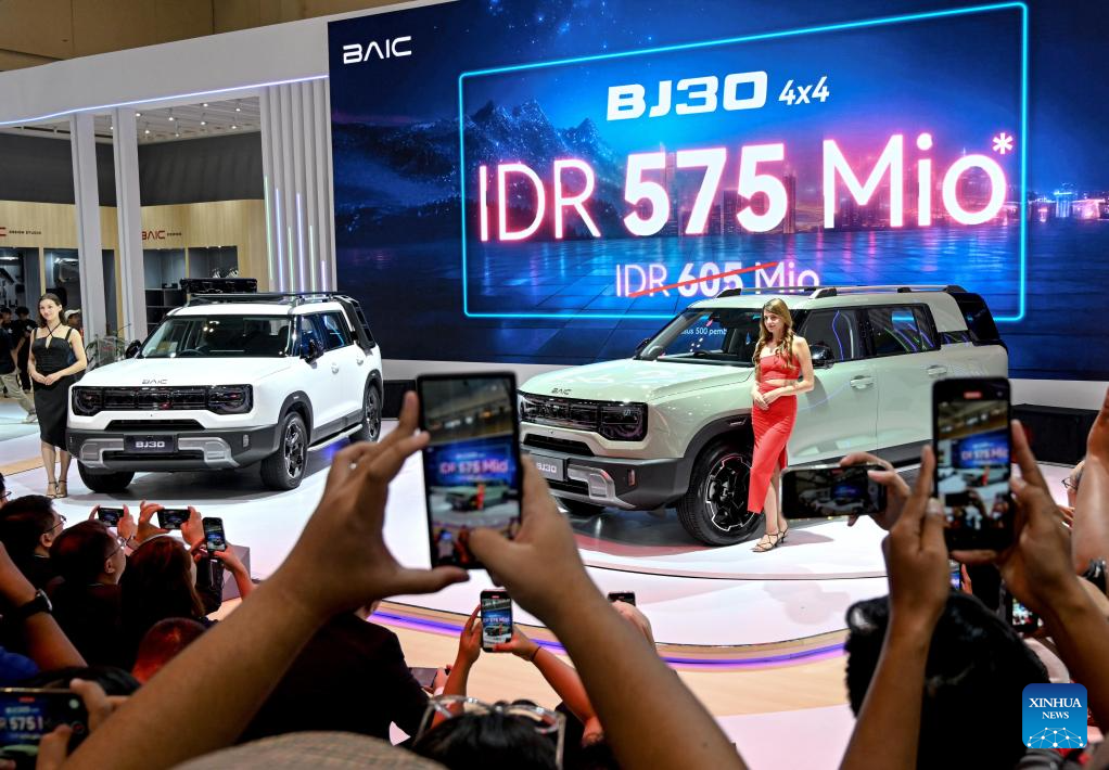 People visit the booth of Chinese auto brand BAIC during the exclusive media day of GAIKINDO Indonesia International Auto Show (GIIAS) 2025 at the Indonesia Convention Exhibition in Tangerang, Banten Province, Indonesia, July 23, 2025. The 32nd GIIAS will open to the public from July 24 to Aug. 3. (Xinhua/Agung Kuncahya B.)