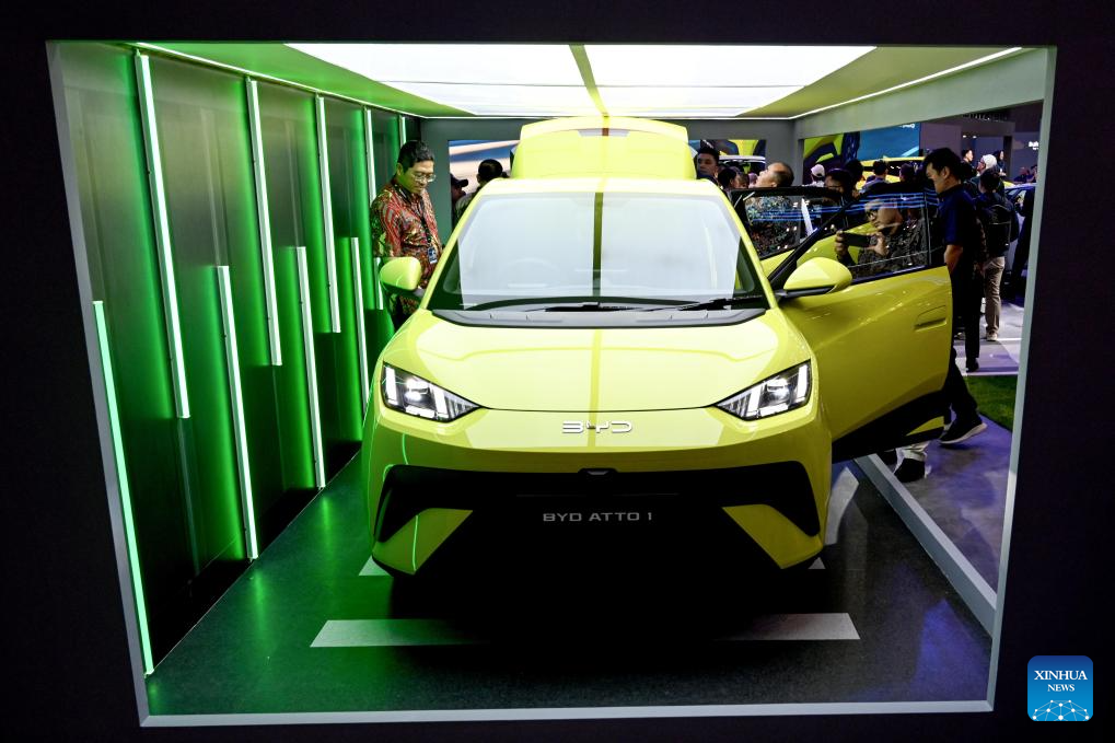 People visit the booth of Chinese auto brand BYD during the exclusive media day of GAIKINDO Indonesia International Auto Show (GIIAS) 2025 at the Indonesia Convention Exhibition in Tangerang, Banten Province, Indonesia, July 23, 2025. The 32nd GIIAS will open to the public from July 24 to Aug. 3. (Xinhua/Agung Kuncahya B.)