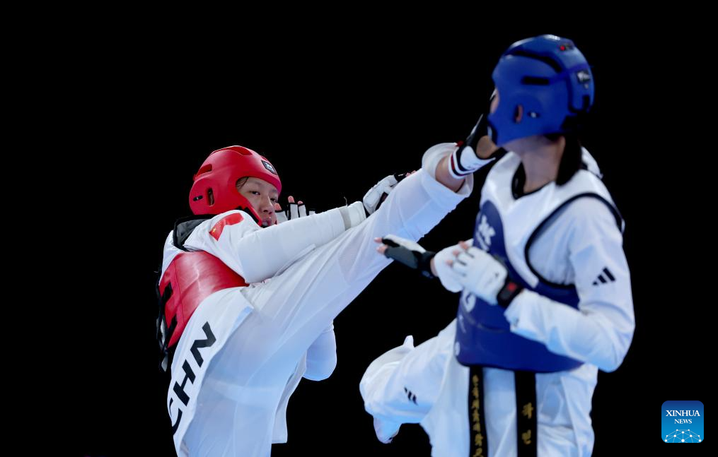 Mu Wenzhe (L) of China reacts during the women's team final of taekwondo between China and South Korea at the Rhine-Ruhr 2025 FISU World University Games in Essen, Germany, July 23, 2025. (Xinhua/Li Ying)