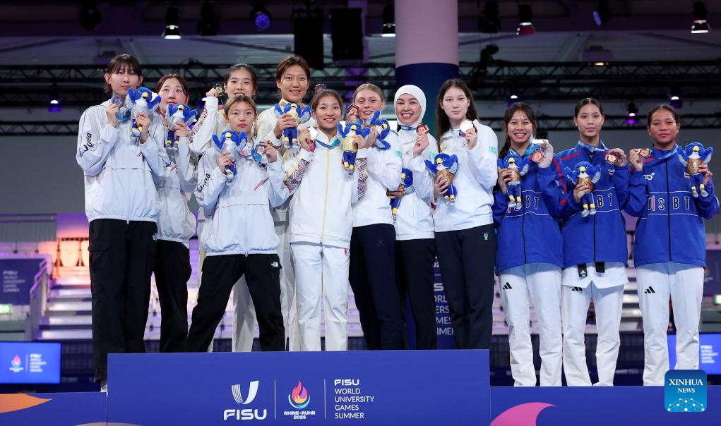 Gold medalists team China, silver medalists team South Korea, bronze medalists team Thailand and team Kazakhstan pose during the awarding ceremony after the women's team final of taekwondo between China and South Korea at the Rhine-Ruhr 2025 FISU World University Games in Essen, Germany, July 23, 2025. (Xinhua/Li Ying)