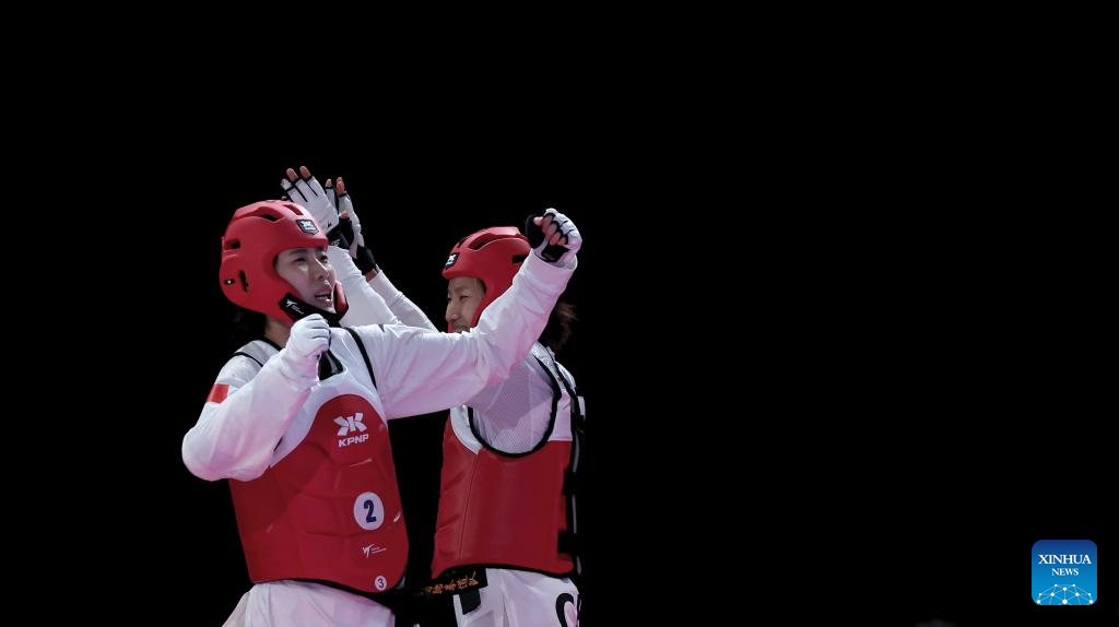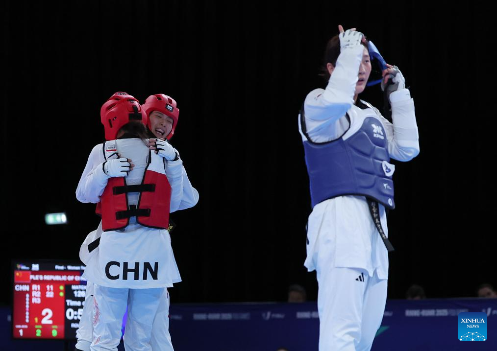Mu Wenzhe (L) of China celebrates during the women's team final of taekwondo between China and South Korea at the Rhine-Ruhr 2025 FISU World University Games in Essen, Germany, July 23, 2025. (Xinhua/Li Ying)