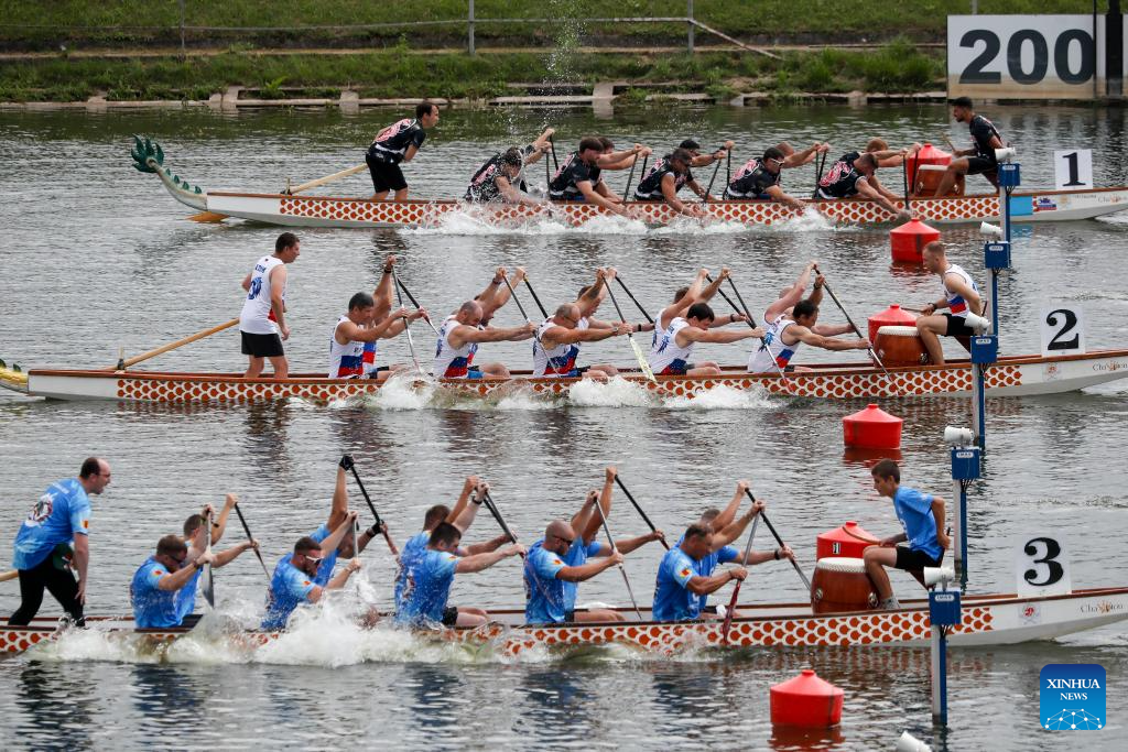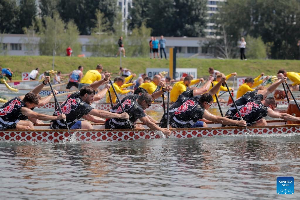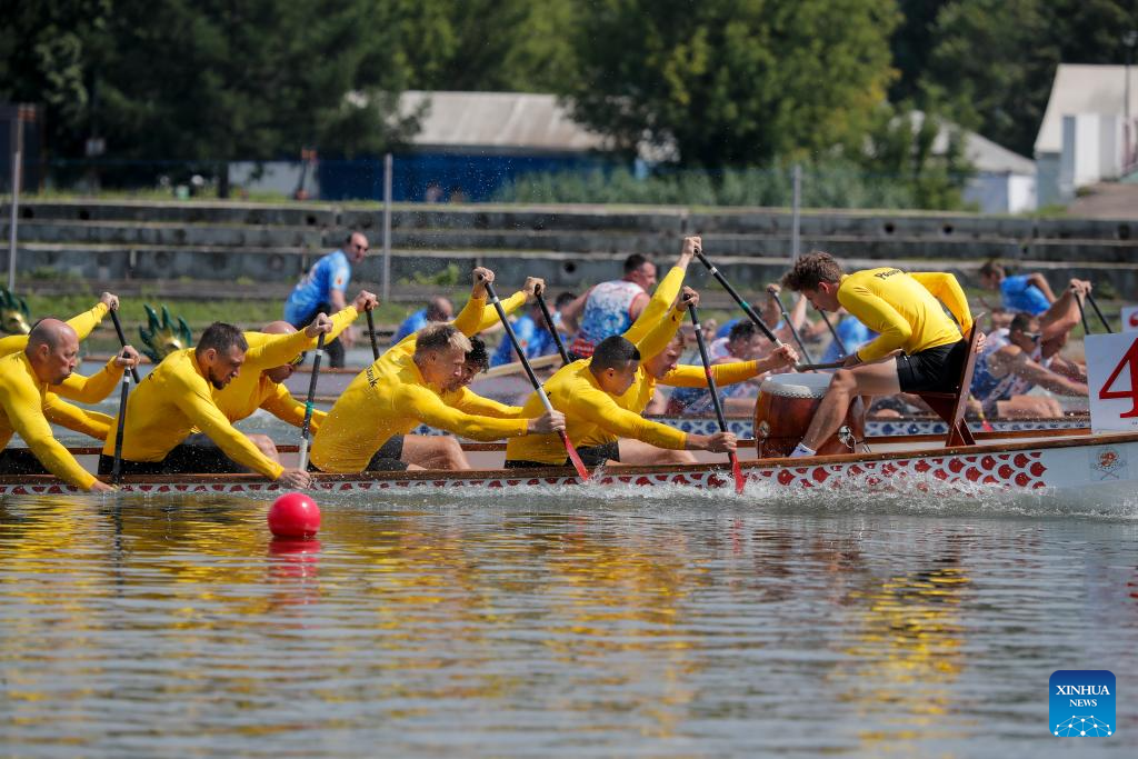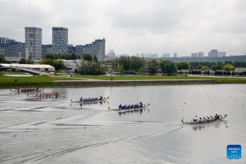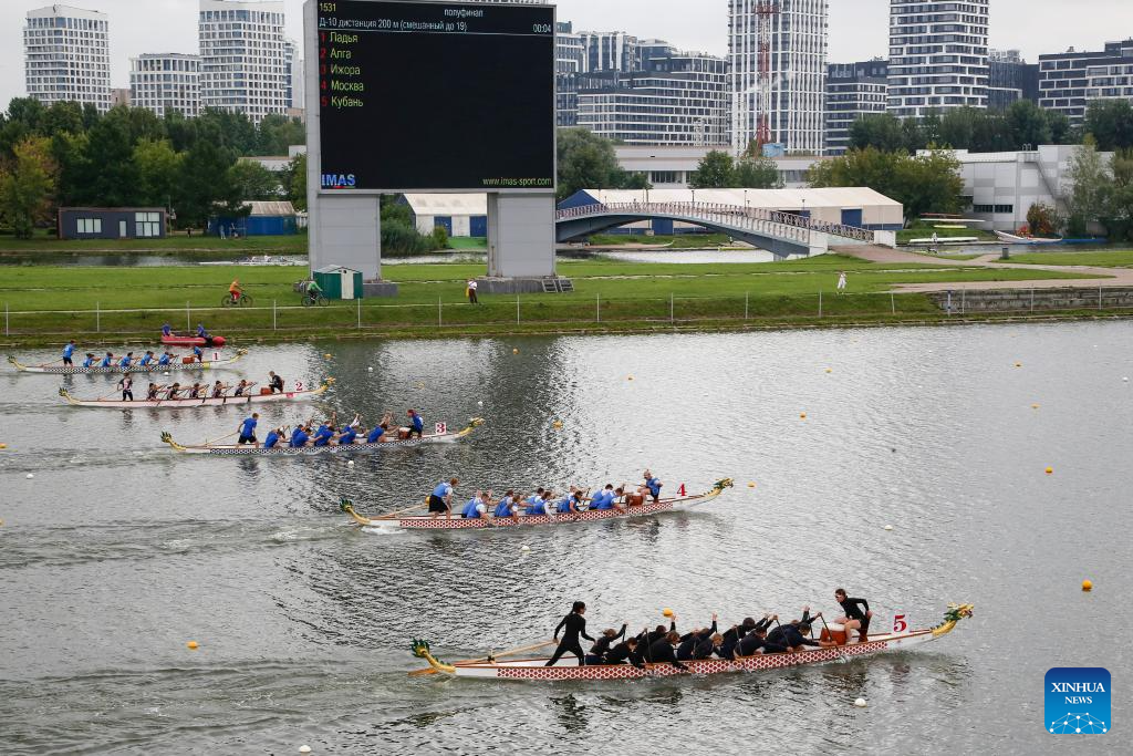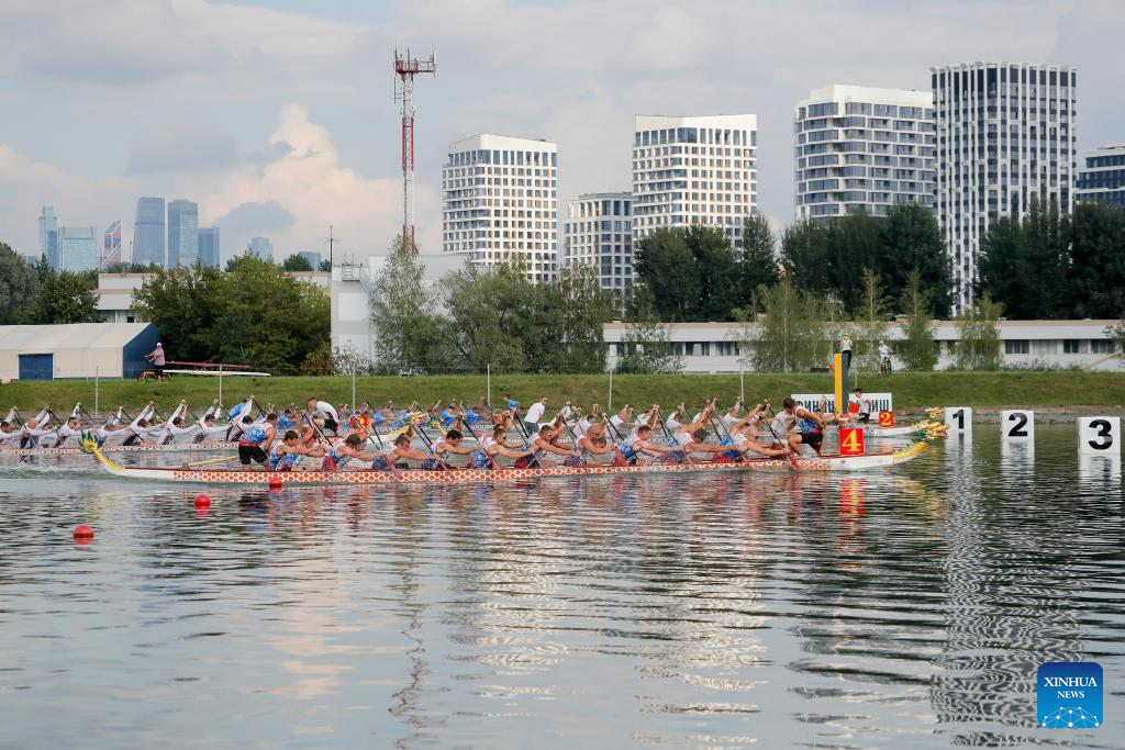 Teams compete during the dragon boat championship of Russia in Moscow, Russia, July 23, 2025. (Photo by Alexander Zemlianichenko Jr/Xinhua)