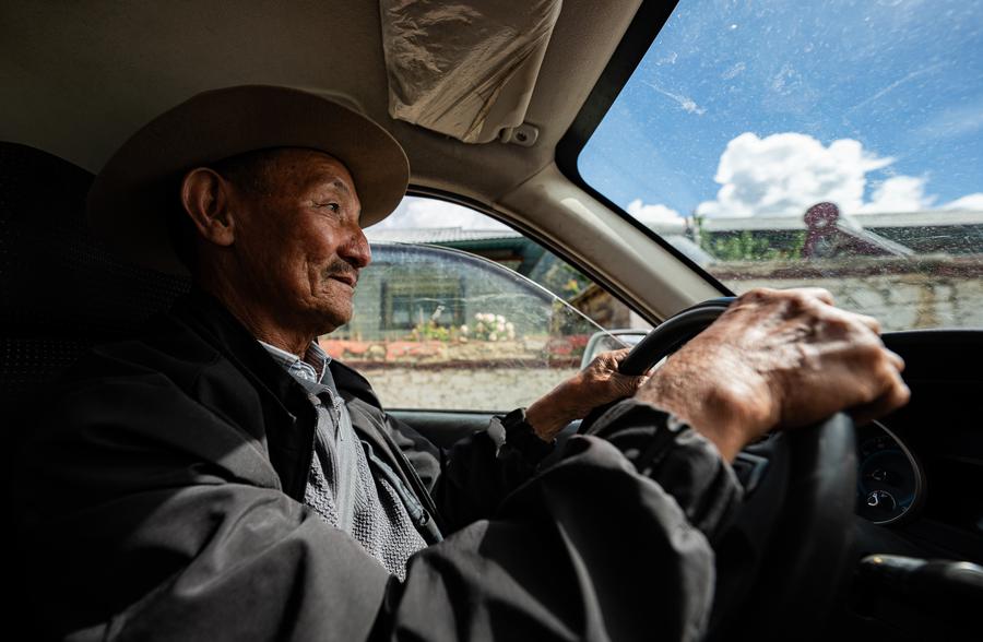 Tobgye drives to Linze ecological and cultural scenic area in Linze Village of Gongbo'Gyamda County, Nyingchi City, southwest China's Xizang Autonomous Region, on July 23, 2025. (Xinhua/Tenzin Nyida)