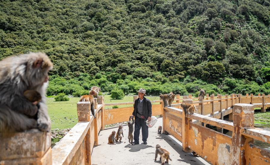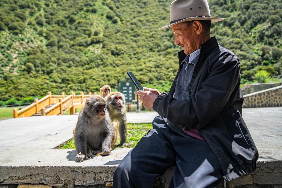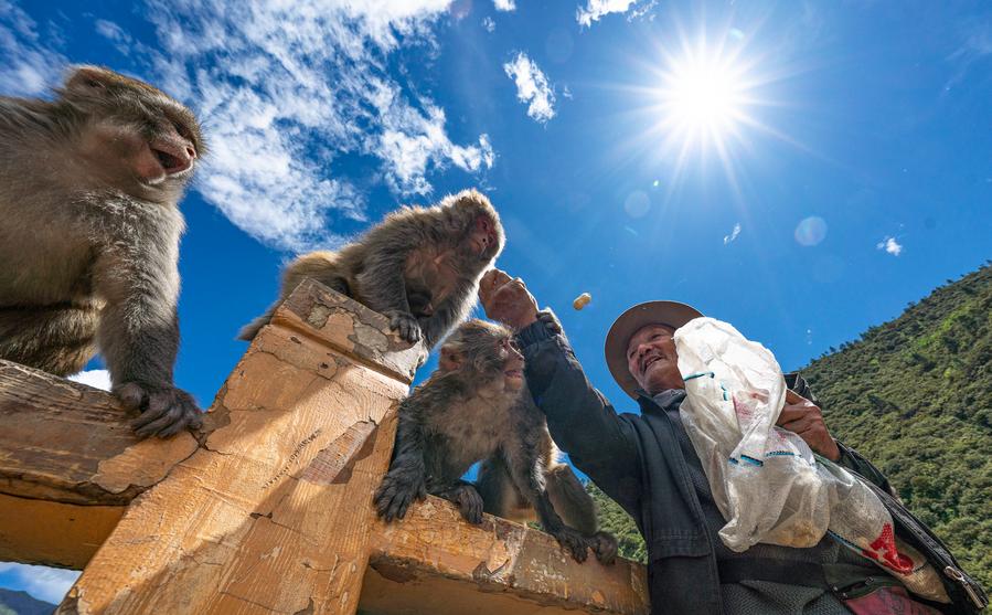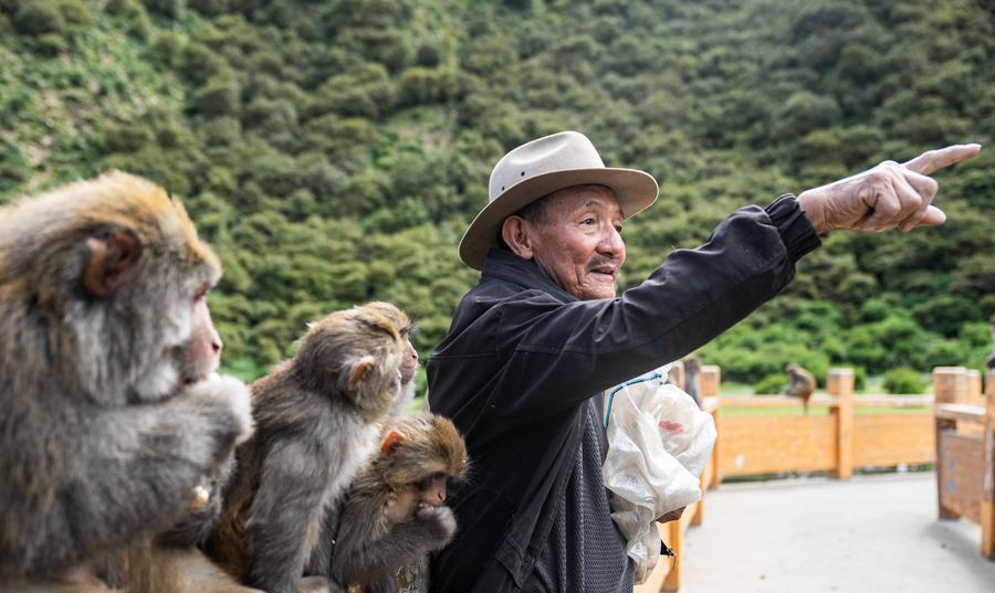 Tobgye feeds peanuts to Tibetan macaques at Linze ecological and cultural scenic area in Linze Village of Gongbo'Gyamda County, Nyingchi City, southwest China's Xizang Autonomous Region, on July 23, 2025. (Xinhua/Tenzin Nyida)