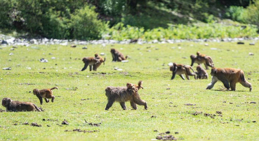 LHASA, July 24 (Xinhua) -- Linze Village in Gongbo'Gyamda County is a well-known habitat of the Tibetan macaque, a national second-class protected animal.