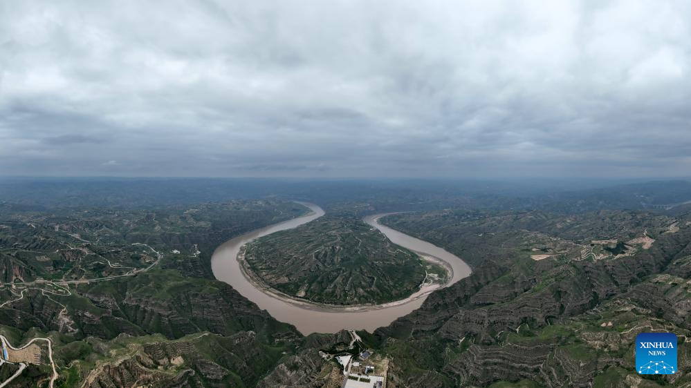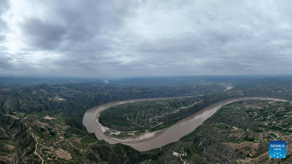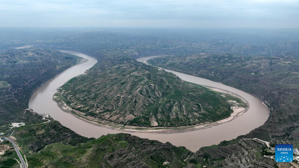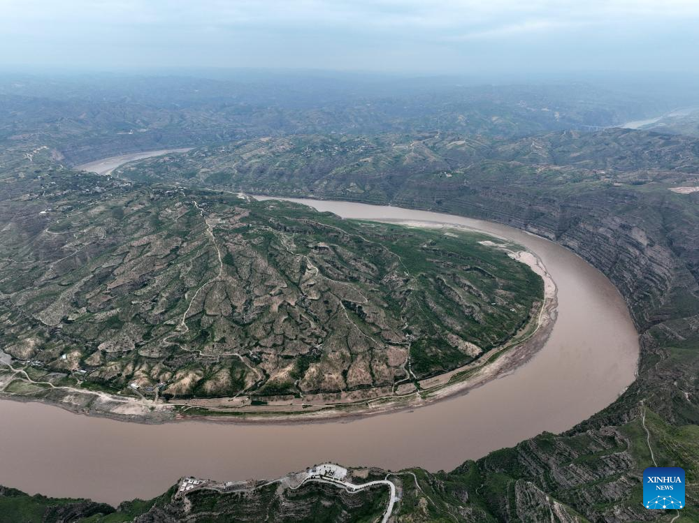 An aerial photo taken on July 24, 2025 shows a scene of a turning of the Yellow River in the border area between Shilou County of north China's Shanxi Province and Qingjian County of northwest China's Shaanxi Province. (Xinhua/Zhan Yan)