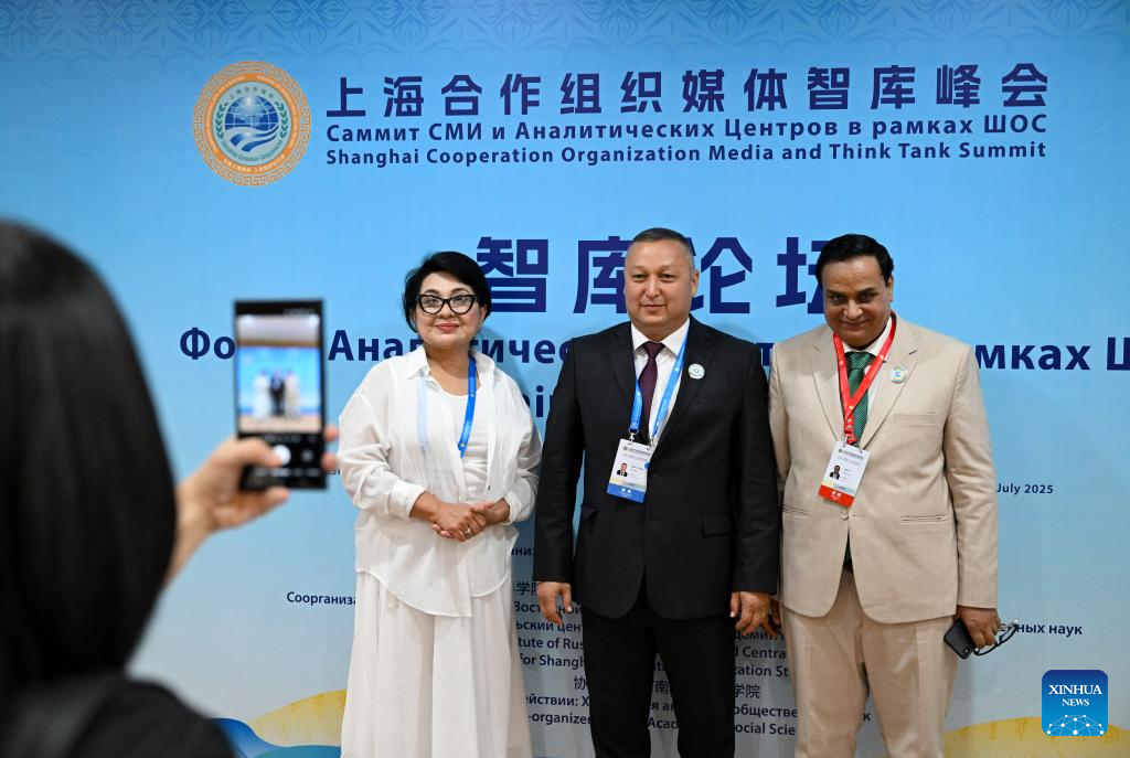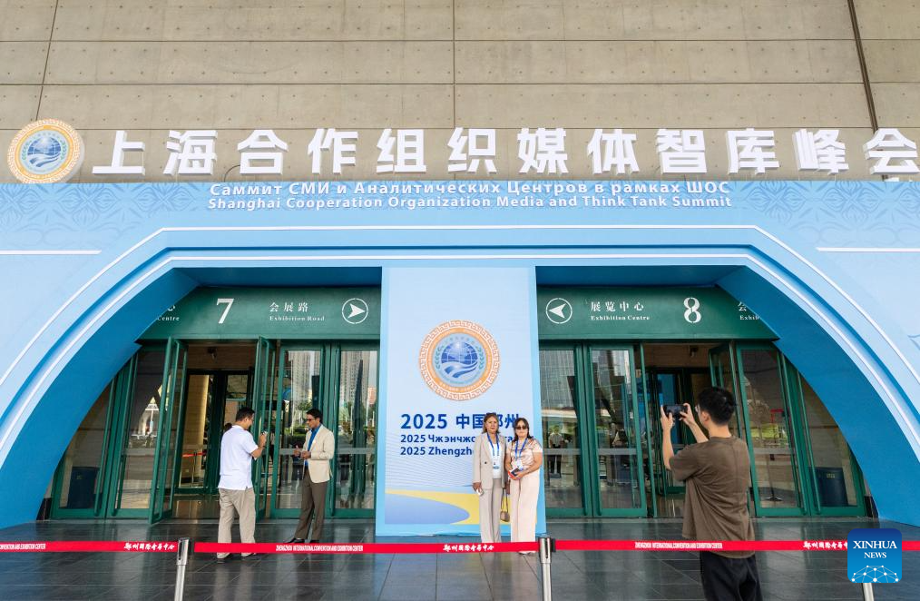 Participants of the Shanghai Cooperation Organization (SCO) Media and Think Tank Summit pose for photos outside the venue in Zhengzhou, central China's Henan Province, July 24, 2025. Themed "Upholding the 'Shanghai Spirit' to Build a More Beautiful Home," the SCO Media and Think Tank Summit is held here from July 23 to 27. (Xinhua/Wu Jingdan)