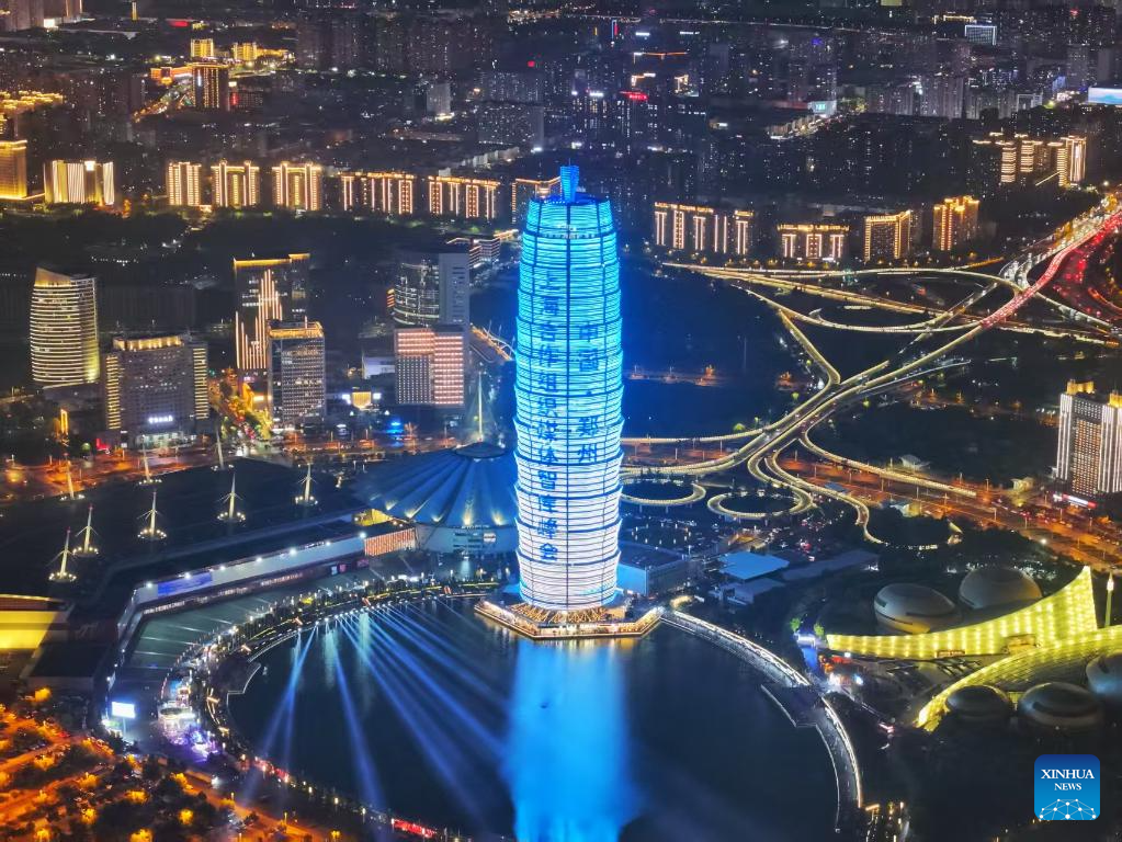 An aerial drone photo taken on July 23, 2025 shows an illuminated building near the Zhengzhou International Convention and Exhibition Center, the venue of the Shanghai Cooperation Organization (SCO) Media and Think Tank Summit, in Zhengzhou, central China's Henan Province. Themed "Upholding the 'Shanghai Spirit' to Build a More Beautiful Home," the SCO Media and Think Tank Summit is held here from July 23 to 27. (Photo by Fu Rui/Xinhua)