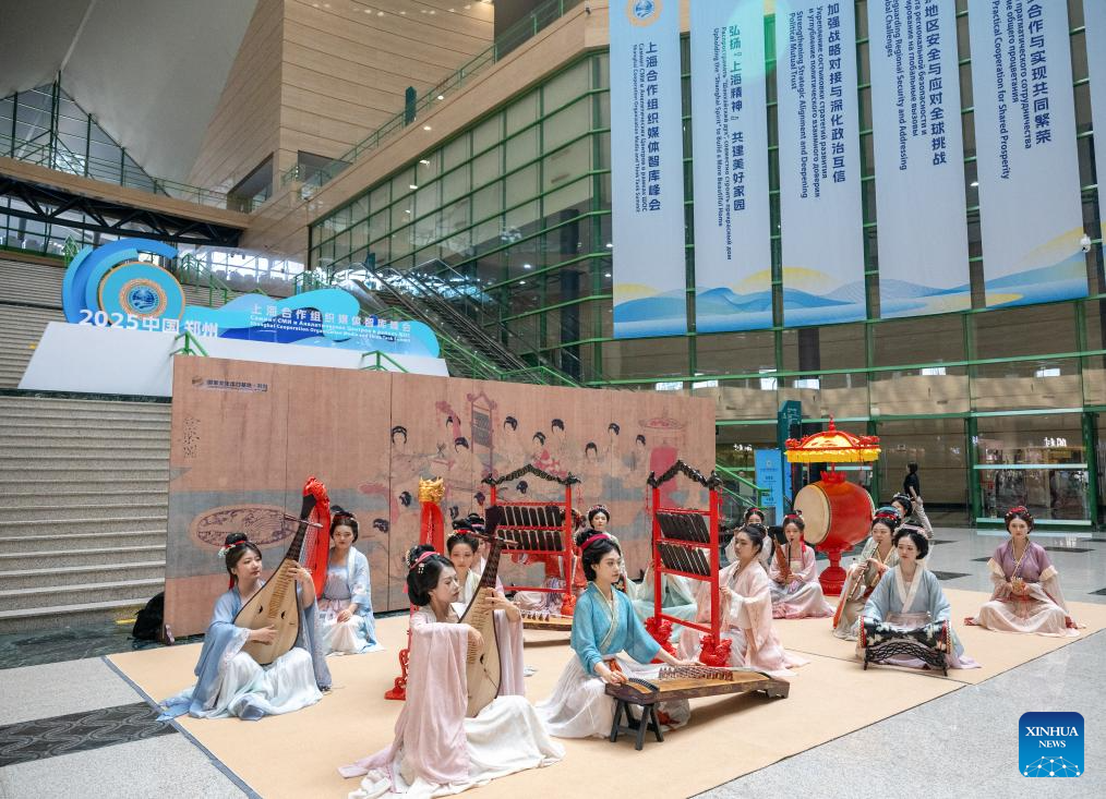 A folk music show reproducing the scene in an ancient Chinese painting is staged at the venue of the Shanghai Cooperation Organization (SCO) Media and Think Tank Summit in Zhengzhou, central China's Henan Province, July 24, 2025. Themed "Upholding the 'Shanghai Spirit' to Build a More Beautiful Home," the SCO Media and Think Tank Summit is held here from July 23 to 27. (Xinhua/Hu Jingwen)