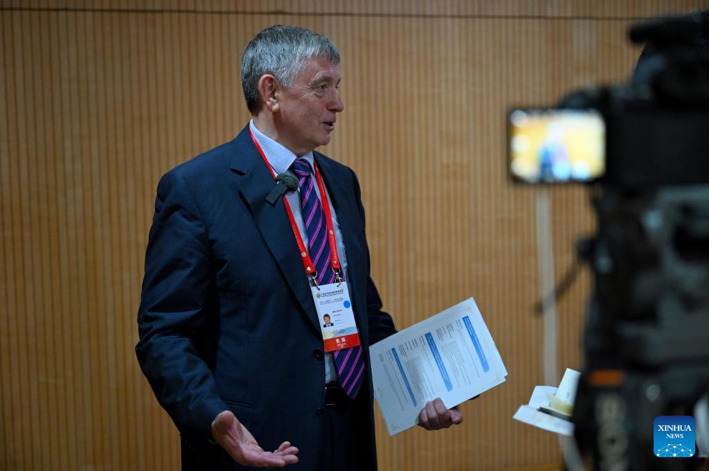 A participant of the Shanghai Cooperation Organization (SCO) Media and Think Tank Summit speaks during an interview in Zhengzhou, central China's Henan Province, July 24, 2025. Themed "Upholding the 'Shanghai Spirit' to Build a More Beautiful Home," the SCO Media and Think Tank Summit is held here from July 23 to 27. (Xinhua/Hao Yuan)