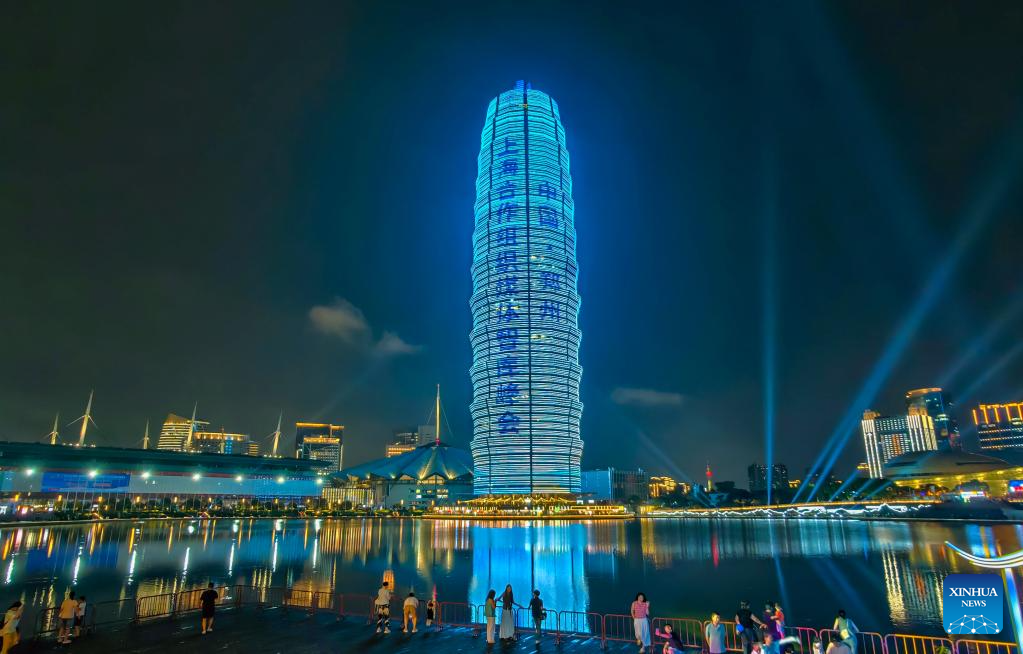 An illuminated building is pictured near the Zhengzhou International Convention and Exhibition Center, the venue of the Shanghai Cooperation Organization (SCO) Media and Think Tank Summit, in Zhengzhou, central China's Henan Province, July 23, 2025. Themed "Upholding the 'Shanghai Spirit' to Build a More Beautiful Home," the SCO Media and Think Tank Summit is held here from July 23 to 27. (Photo by Gu Yu/Xinhua)