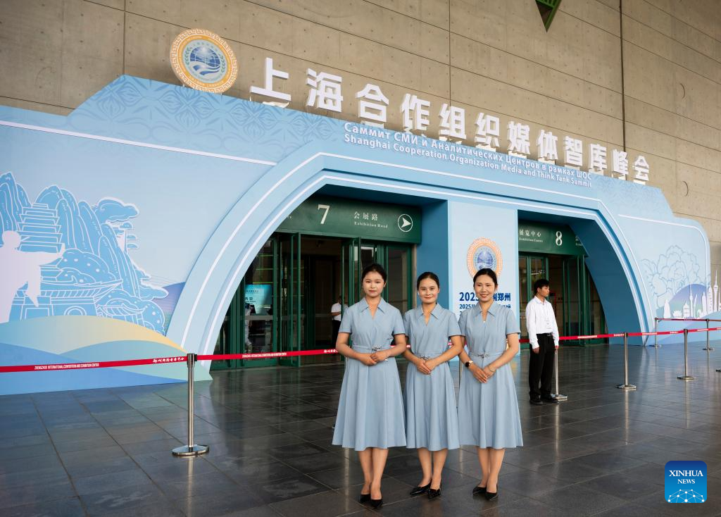 Dedicated tour guides pose for a group photo outside the venue of the Shanghai Cooperation Organization (SCO) Media and Think Tank Summit in Zhengzhou, central China's Henan Province, July 24, 2025. Themed "Upholding the 'Shanghai Spirit' to Build a More Beautiful Home," the SCO Media and Think Tank Summit is held here from July 23 to 27. (Xinhua/Fu Tian)