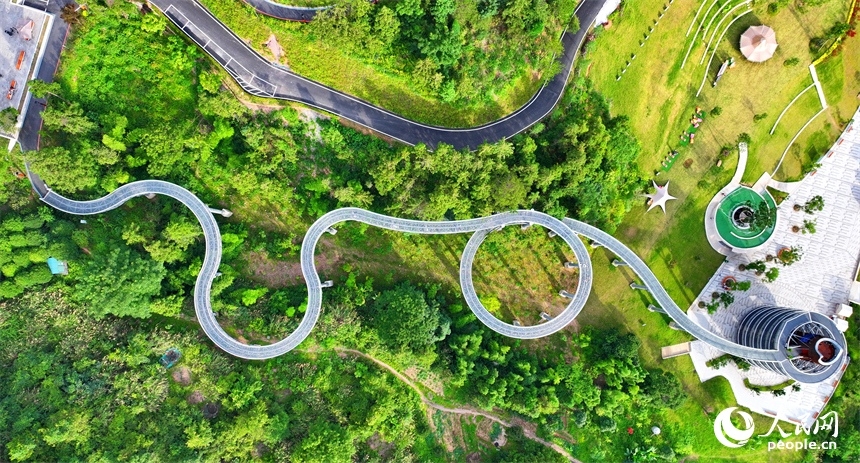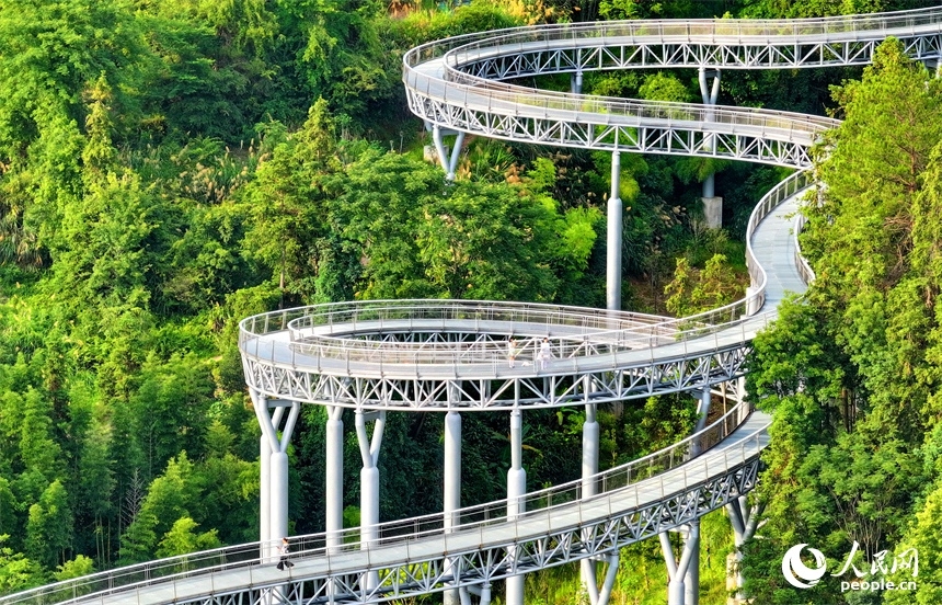 People walk along a steel-grate walkway in the urban forest space in Chongyi county, Ganzhou city, east China's Jiangxi Province. (People's Daily Online/Zhu Haipeng)