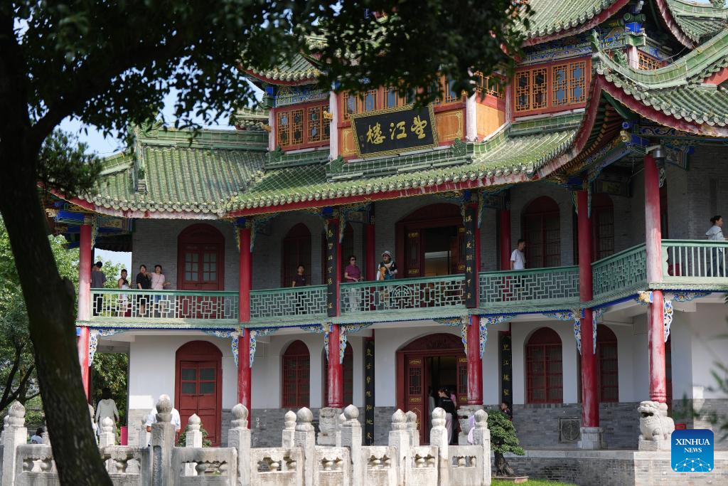 Tourists visit the relics of the ancient pavilion in Hanzhong, northwest China's Shaanxi Province, July 22, 2025. Hanzhong is nestled between the Qinling and Daba Mountains, with the Hanjiang River, a tributary of the Yangtze River, flowing through the city. For more than 2,300 years, it has served as a vital nexus for the river network and transportation routes connecting the north and south. The city is rich in resources and, unlike other areas in Shaanxi, it shows distinct characteristics in dialect and culinary traditions influenced by southwest China's Sichuan. (Xinhua/Li Yibo)