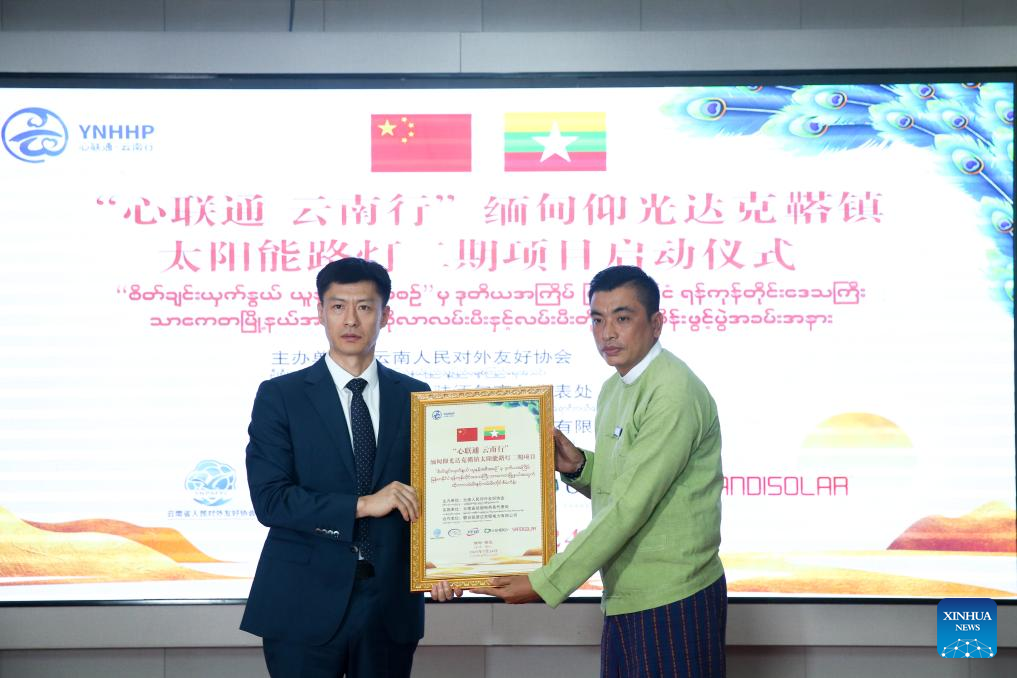 At the event, 40 solar streetlights, provided by the Yunnan Provincial People's Association for Friendship with Foreign Countries, were handed over to the chairman of the Thaketa township administration body.